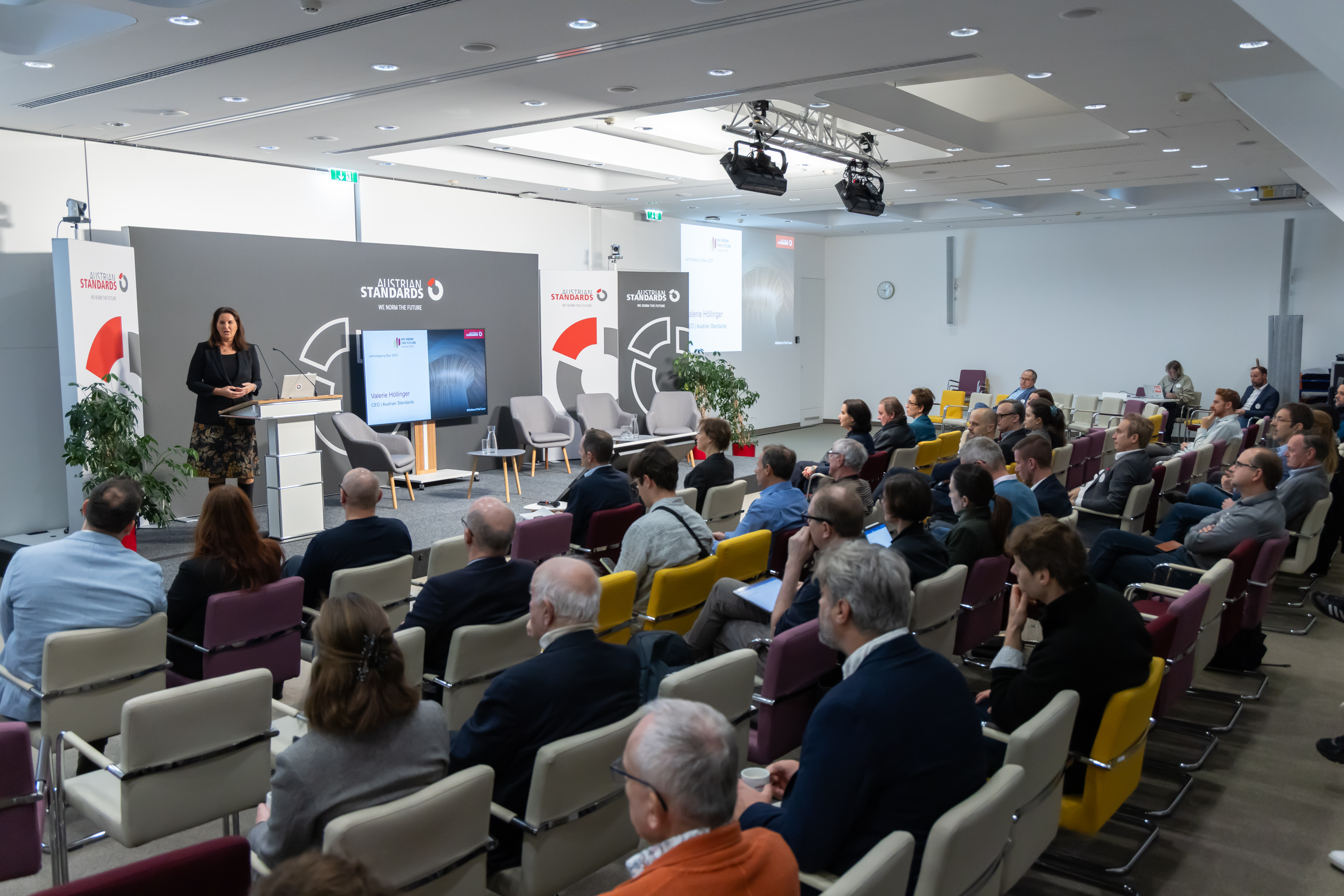 Als Abschluss des WE NORM THE FUTURE | Summit 2025 zeigte das große Interesse an der Jahrestagung Bau 2025 – einer Kooperation von Austrian Standards und der Bundesinnung Bau der WKÖ, moderiert von Gudrun Ghezzo –, wie bedeutend dieses Thema für den Bausektor ist. Angesichts wachsender Nachhaltigkeitsanforderungen und zunehmenden Preisdrucks arbeitet der Bausektor daran, wirtschaftliche Erfolge weiter auszubauen. Denn klimafreundliches und dabei leistbares Bauen wird immer öfter gefordert, und das in einem heißumkämpften Markt. Valerie Höllinger, CEO von Austrian Standards, betonte in ihrer Eröffnungsrede, dass Bauen immer ein Wert für Generationen sei und unter dem Aspekt der Leistbarkeit und Wirtschaftlichkeit gesehen werden müsse. „Was wir heute errichten, wird das Leben kommender Generationen prägen. In einer Welt, die stark vom Klimawandel geprägt sein wird, ist Klimaneutralität wichtig, aber sie reicht nicht mehr: Wir brauchen Klimaresilienz. Dazu gehören Planungsinstrumente, die Extremereignisse realistisch abbilden, Bauprodukte, die langfristig robust sind, und Standards, die Klimarisiken systematisch berücksichtigen. Ohne Standards wird der Übergang in eine klimafitte, digitale und leistbare Bauwelt nicht gelingen“