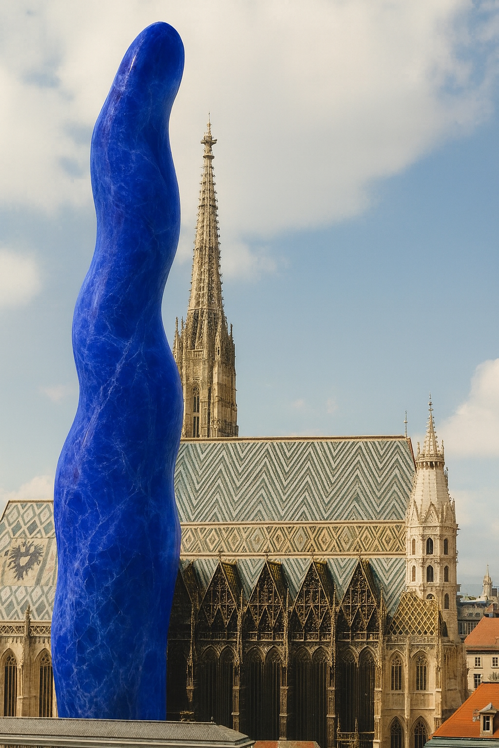 Im Zentrum des Projekts steht der Entwurf eines zweiten Turms, der dem Stephansdom gegenübergestellt ist. Er ist nicht als Bauvorhaben gedacht, sondern als geistige Setzung. Der Turm ist in einem tiefen Blau konzipiert und als unmögliche Forderung aus Lapislazuli formuliert – einem Material, das seit Jahrhunderten für Transzendenz und geistige Dauer steht. Dass ein solcher Turm nicht realisierbar ist, gehört zur Aussage.