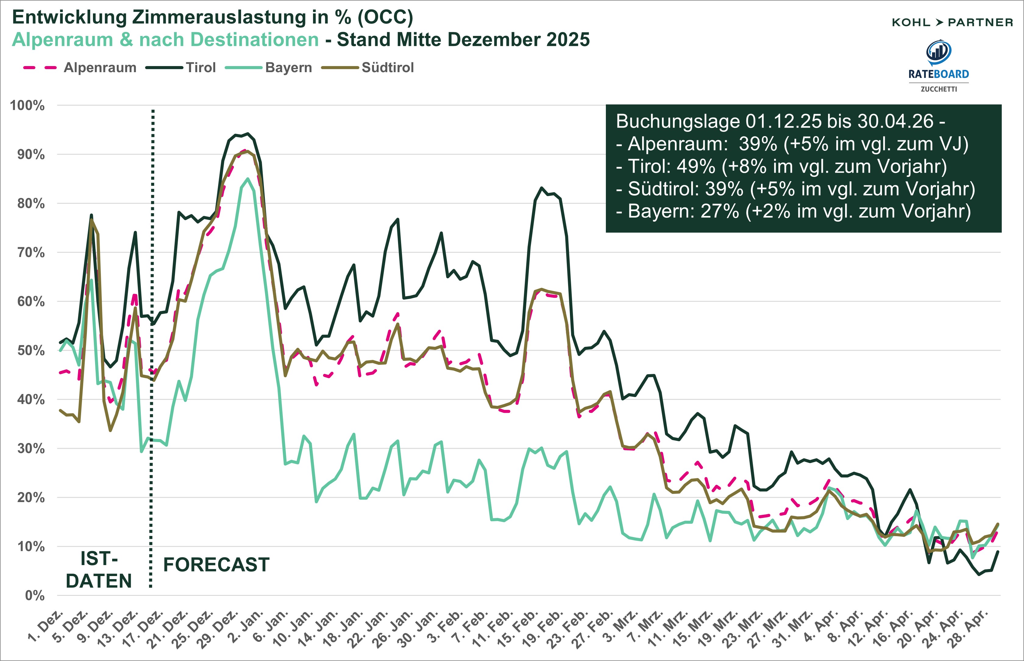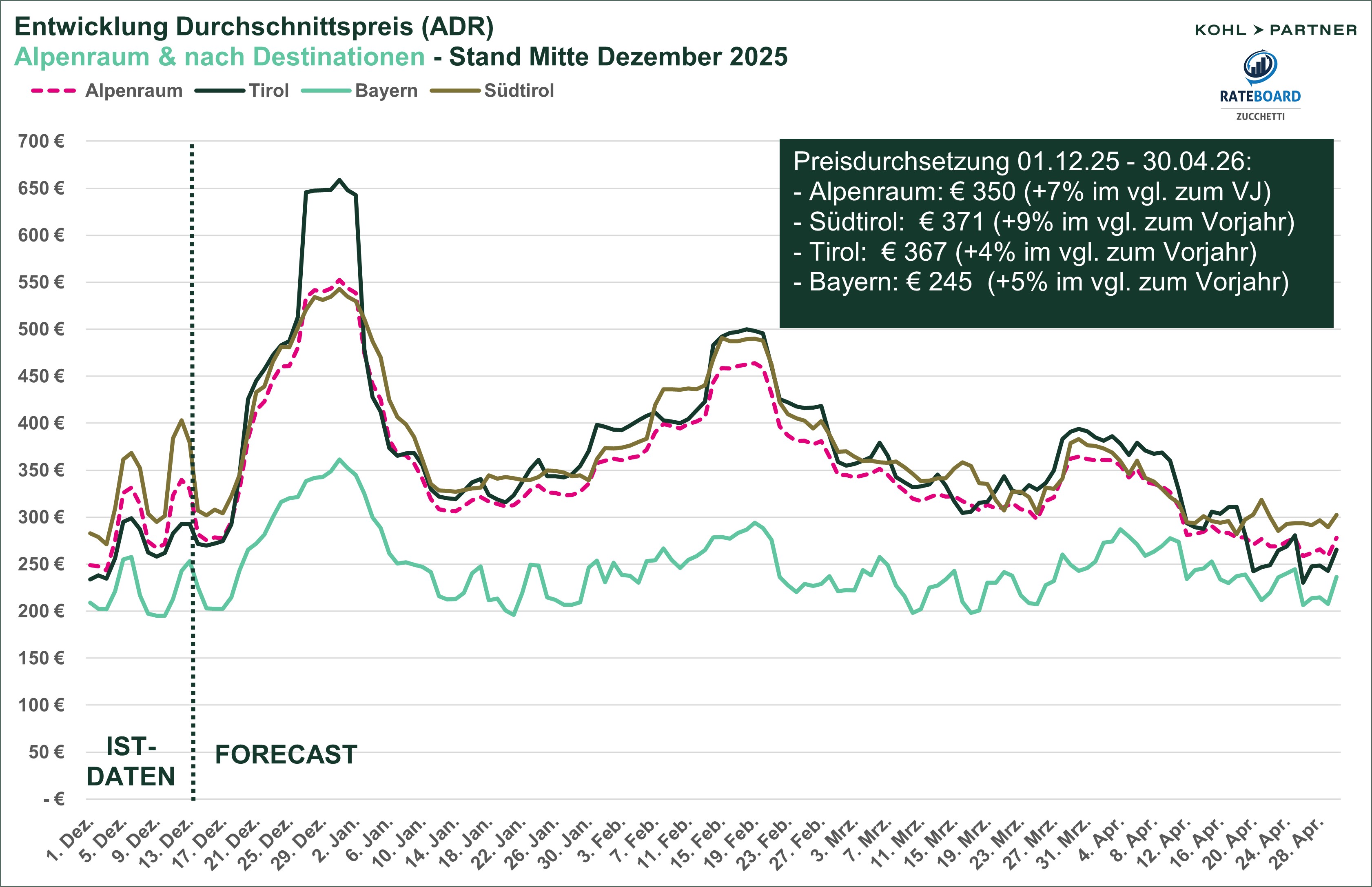 Der Faktencheck von Kohl & Partner und RateBoard zeigt für die Wintersaison 2025/26 im Alpenraum eine solide Ausgangslage. Die Nachfrage liegt über dem Vorjahr, bei deutlich regionalen Unterschieden. Tirol führt bei Auslastung und Wachstum, Südtirol liegt im Mittelfeld, Bayern bleibt zurück. Auch die Preise steigen insgesamt, wobei Südtirol seine Position als Preisführer behauptet, Tirol moderat zulegt und Bayern weiterhin unter dem alpinen Niveau liegt.