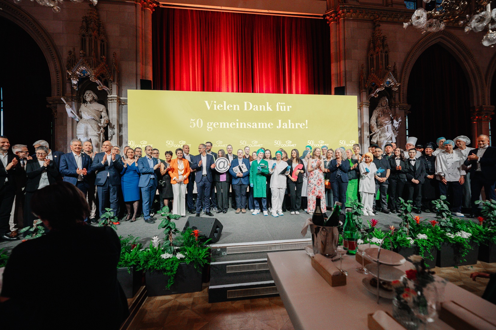 Das Highlight für Kund:innen und Partner:innen war ein Jubiläumsfest im Wiener Rathaus mit mehr als 600 Gästen und der Premiere des neuen GOURMET Unternehmensfilms. Bei einer Berufsgruppenpräsentation holte GOURMET die Mitarbeiter:innen vor den Vorhang und zeigte die Vielfalt der Arbeitsbereiche im Unternehmen.