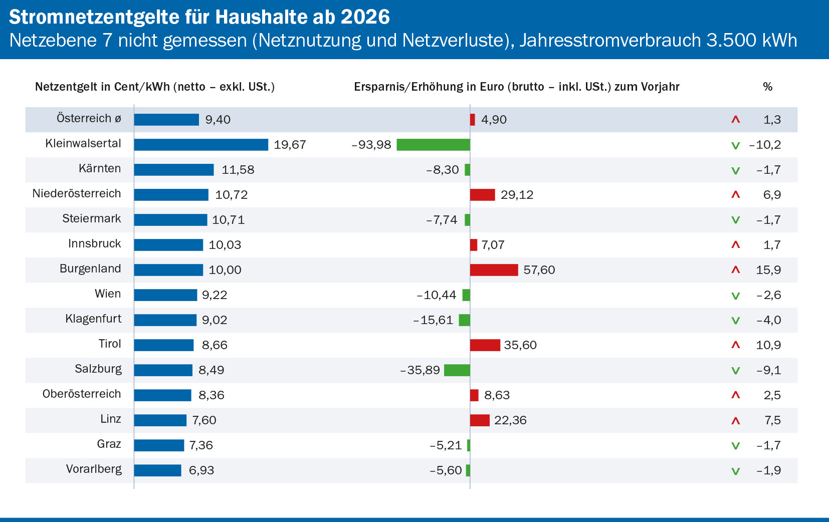 Die Stromnetzentgelte für 2026 werden im Österreichschnitt für Haushalte leicht ansteigen. Regional gibt es allerdings unterschiedliche Veränderungen