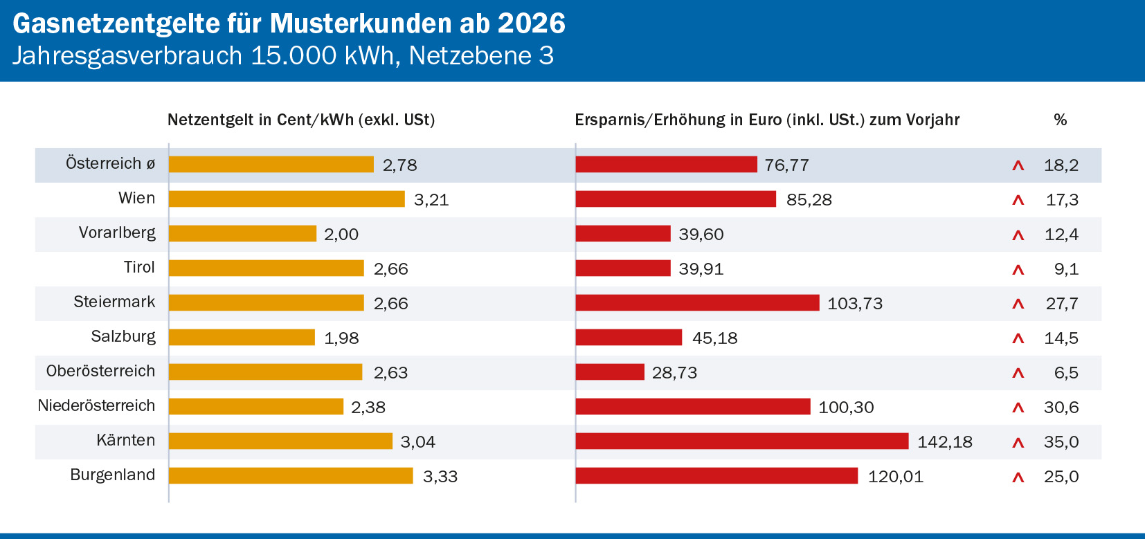 Die Gasnetzentgelte für 2026 werden im Österreichschnitt in allen Netzbereichen ansteigen