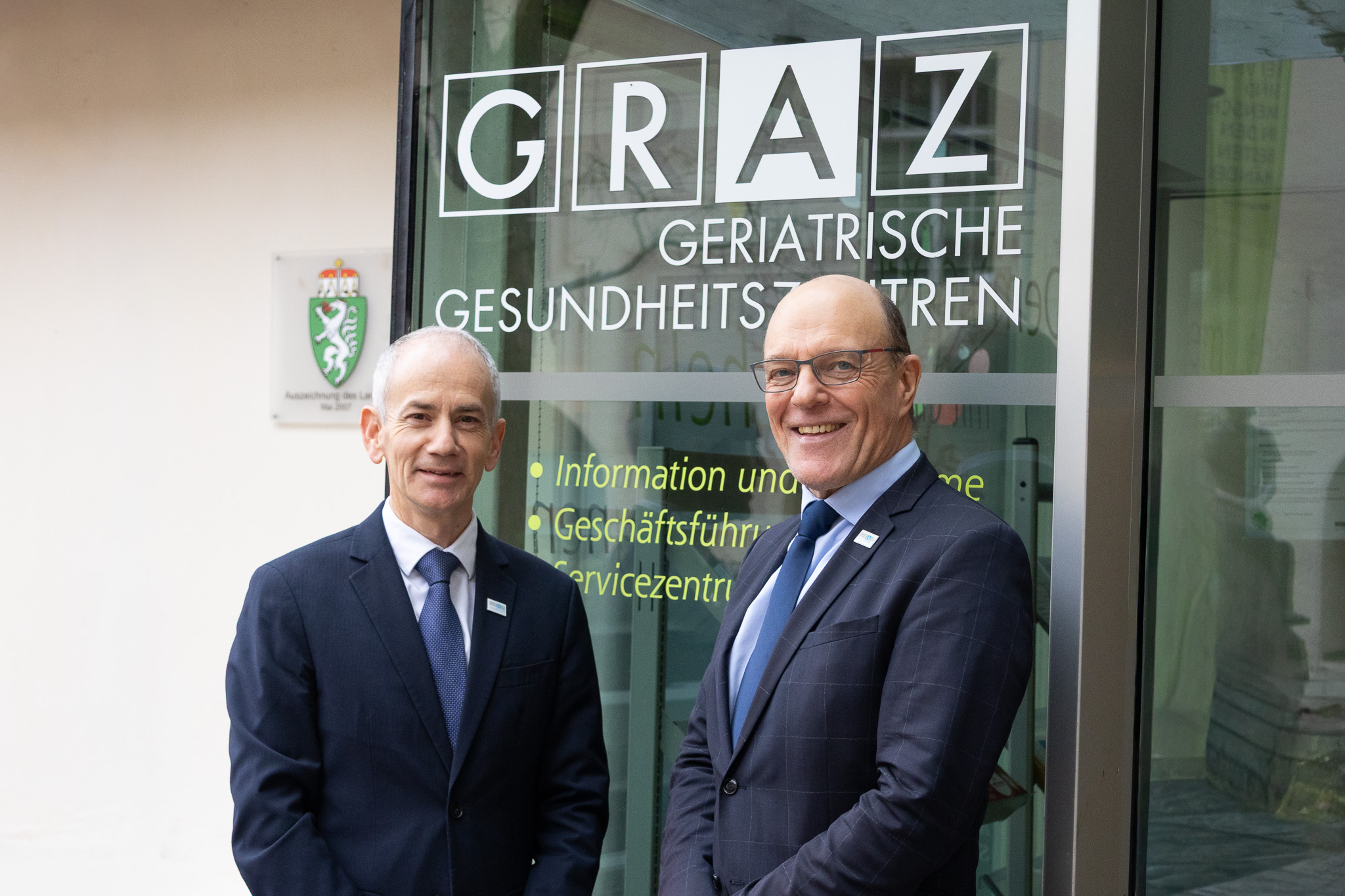 26 Jahre hat Gerd Hartinger als Geschäftsführer die Geriatrischen Gesundheitszentren der Stadt Graz (GGZ) aufgebaut und geleitet. Mit Jahresende geht er in den wohlverdienten Ruhestand und übergibt seine Agenden an Nachfolger Andreas Jaklitsch. In einer bewegenden Feier würdigten zahlreiche Wegbegleiter:innen, Mitarbeiter:innen, sowie Vertreter:innen aus Politik und Partner:innenorganisationen sein langjähriges Engagement. Unter der langjährigen Führung von Gerd Hartinger entwickelten sich die GGZ zu einem modernen Kompetenzzentrum für Altersmedizin und Pflege.