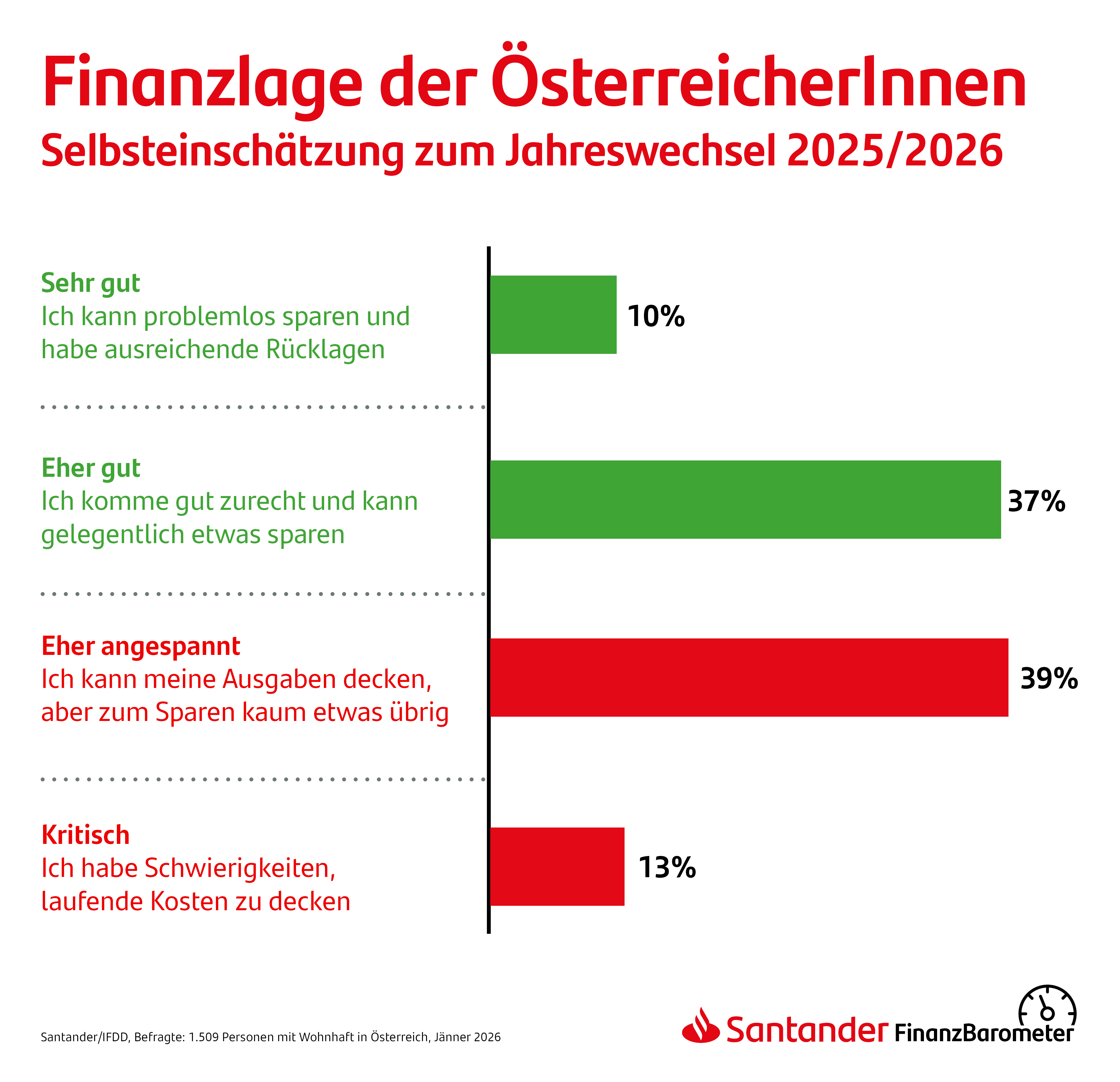 Das Santander-Finanzbarometer liefert regelmäßig Einblicke in das Finanzverhalten der Österreicherinnen und Österreicher. Die vorliegende repräsentative Erhebung für die neue Ausgabe wurde Anfang Jänner 2026 vom Institut für Demoskopie und Datenanalyse (IFDD) im Auftrag von Santander durchgeführt. Befragt wurden über 1.500 Personen mit Wohnort in Österreich. Die Schwankungsbreite beträgt 2,5%.