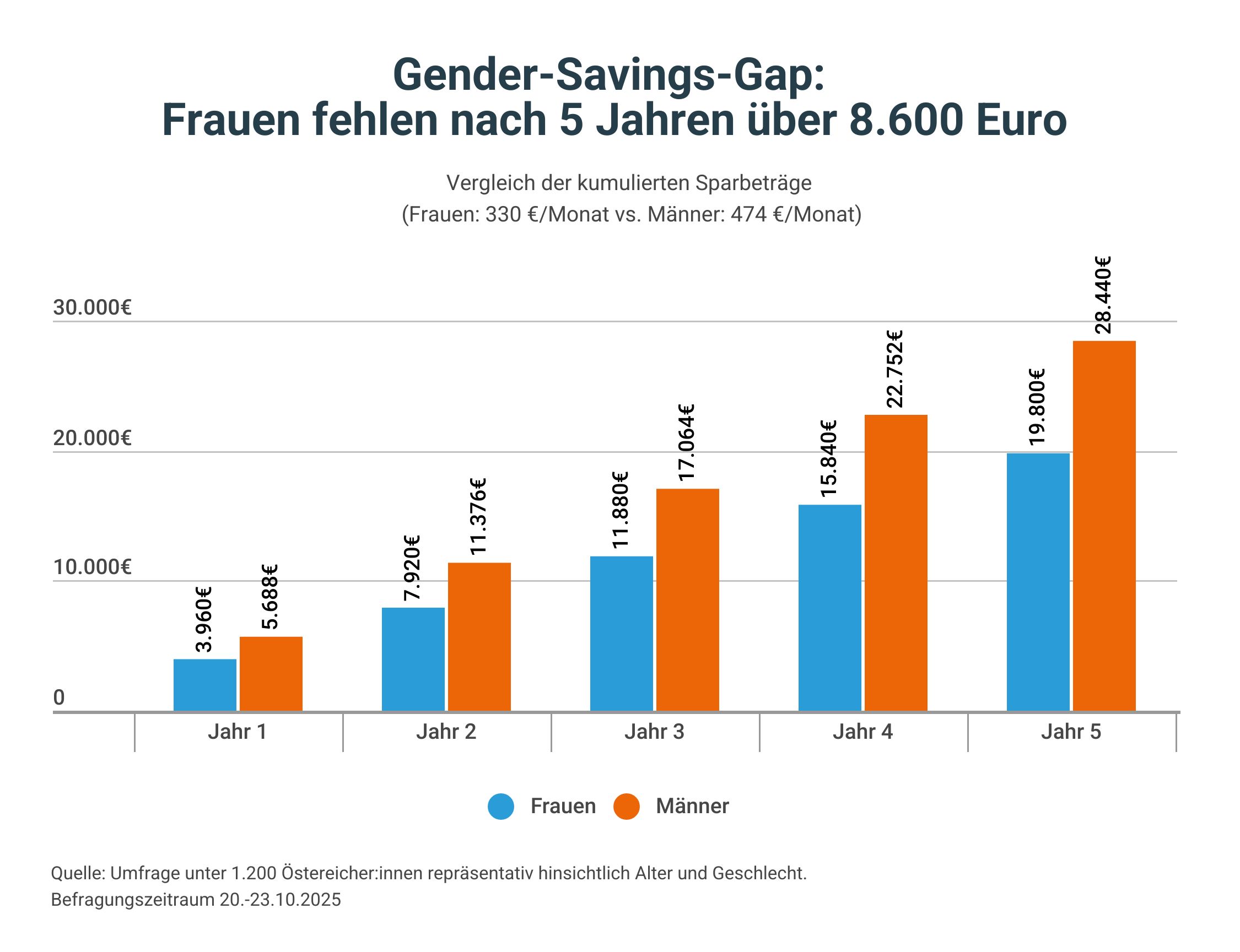 Während Männer monatlich durchschnittlich 474 Euro (Median: 300 Euro) zurücklegen, sind es bei Frauen lediglich 330 Euro (Median: 200 Euro). Damit beträgt der „Gender-Savings-Gap“ rund 43 Prozent. Was als jährlicher Unterschied von 1.728 Euro beginnt, kann sich sich in fünf Jahren auf einen Differenzbetrag von bis zu 9.075 Euro (vor KESt) summieren.[2] „Die Zahlen zeigen, dass Frauen weniger Geld zur Seite legen können als Männer. Das kann langfristig spürbare Auswirkungen auf die finanzielle Absicherung haben. Schließlich muss auch der Zinseszinseffekt berücksichtigt werden“, erklärt Manuel Wukovits, Experte für Bankprodukte bei durchblicker.