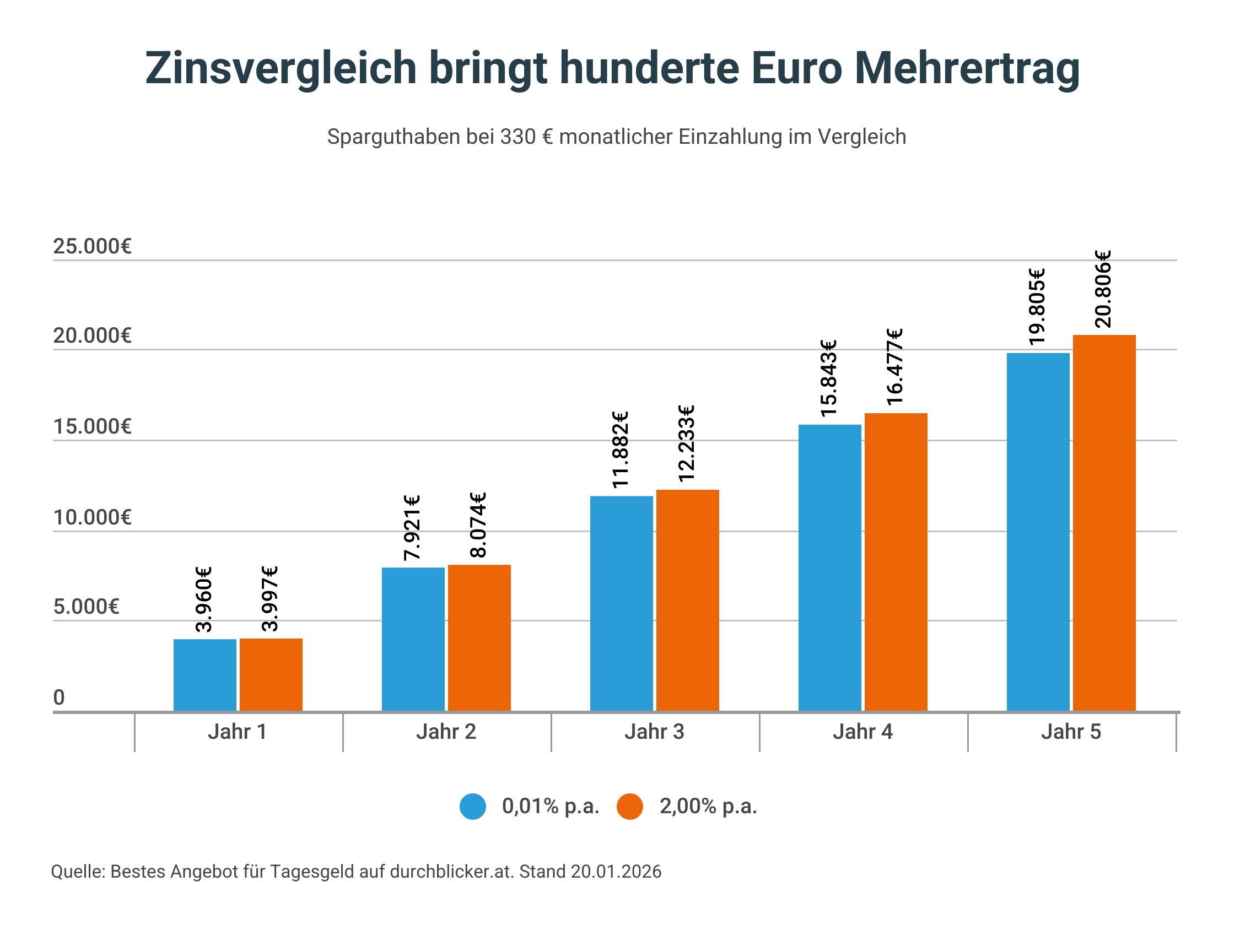 “Unabhängig von der monatlichen Sparrate bleibt die bestmögliche Verzinsung der einfachste Hebel für den langfristigen Vermögensaufbau”, erklärt Wukovits. Aktuell bieten die besten Tagesgeldkonten in Österreich Zinsen von rund 2 Prozent p.a., während viele Banken weit darunter liegen – teilweise bei Tiefstwerten von lediglich 0,01 Prozent. Das macht einen massiven Unterschied: Bei einer monatlichen Sparrate von 330 Euro summieren sich die Zinsen im schlechtesten Fall nach fünf Jahren auf rund 5 Euro. Das beste Angebot hingegen bringt im gleichen Zeitraum über 1.000 Euro Zinsertrag. „Der Vergleich von mehr als 80 nationalen, und internationalen Instituten auf durchblicker.at ist kostenlos und dauert nur drei Minuten, stellt aber mittel- bis langfristig die Weichen für das Erreichen der persönlichen finanziellen Ziele", so Wukovits weiter.