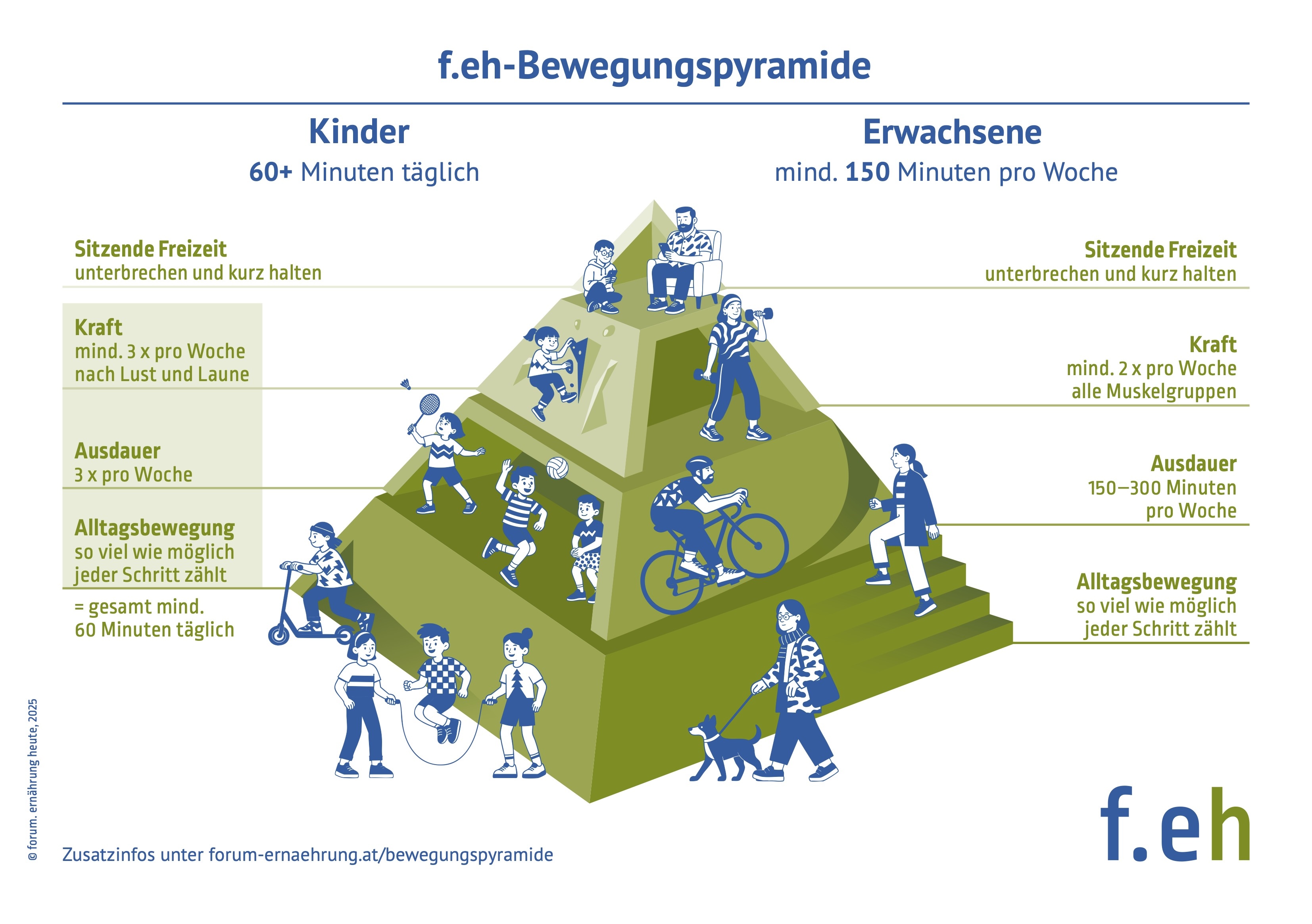 Hier setzt die f.eh-Bewegungspyramide, die von den Österreichischen Bewegungsempfehlungen des Fonds Gesundes Österreich (FGÖ) abgeleitet ist, an: Die Spitze bilden – wie das „Süße“ und Snacks in der Ernährungspyramide – die sitzende Freizeit und der Müßigang als etwas, das idealerweise bewusst zur Entspannung, jedoch nur in Maßen Platz hat. Das Fundament sind Alltagsbewegung, aktive Pausen und die Verteilung über den Tag, weil sie regelmäßig und ohne großen Zeitaufwand möglich sind. Dazwischen finden sich Ausdauer- und Kraftsport.