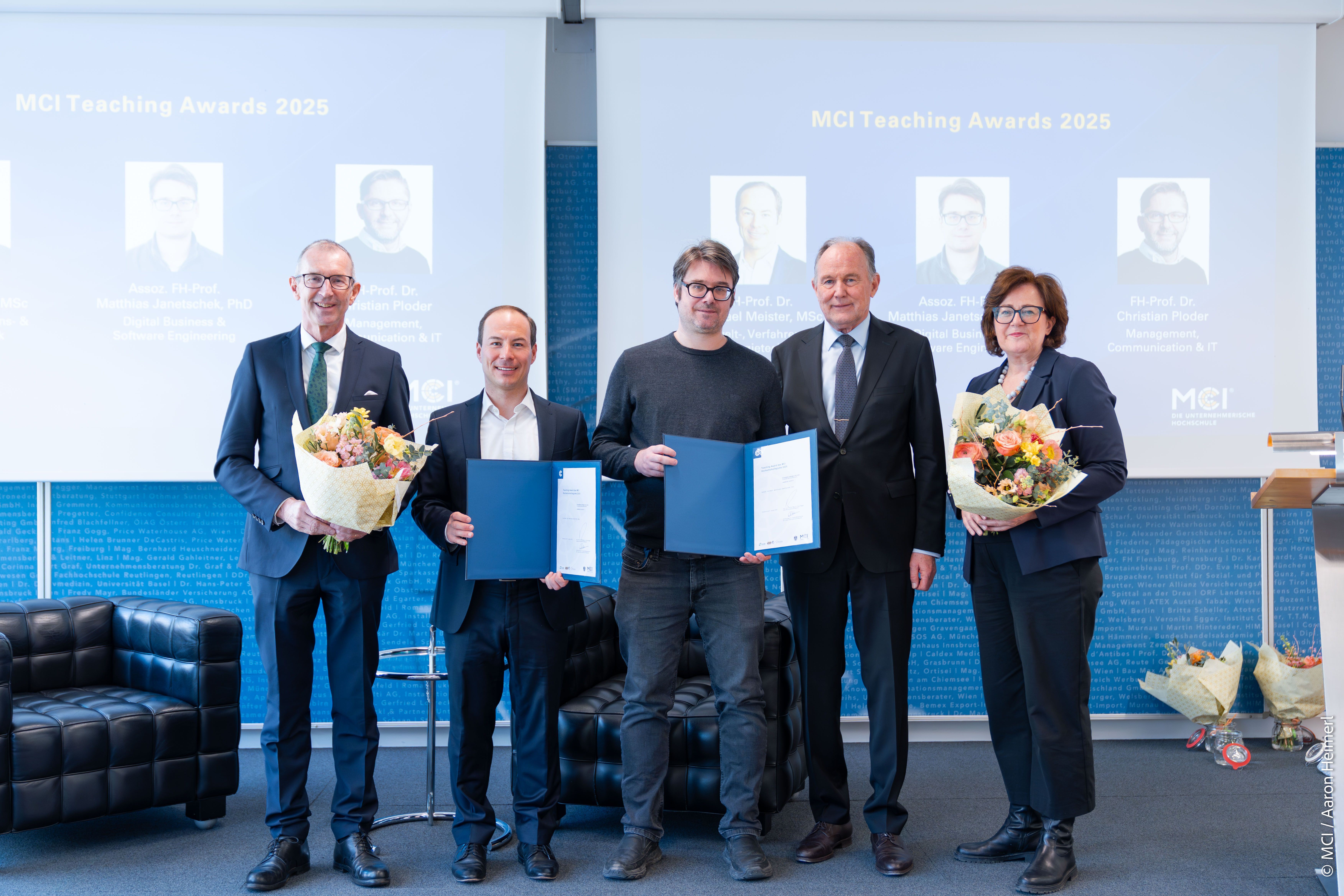 In Anerkennung von herausragenden Leistungen in der Lehre verleiht das MCI Hochschulkollegium seit 2015 jährlich den Teaching Award. Die Nominierung der Lehrenden erfolgt automatisch und umfassend auf Basis der Lehrveranstaltungsevaluierung durch die Studierenden. 2025 geht die Auszeichnung an Matthias Janetschek, Michael Meister und Christian Ploder.