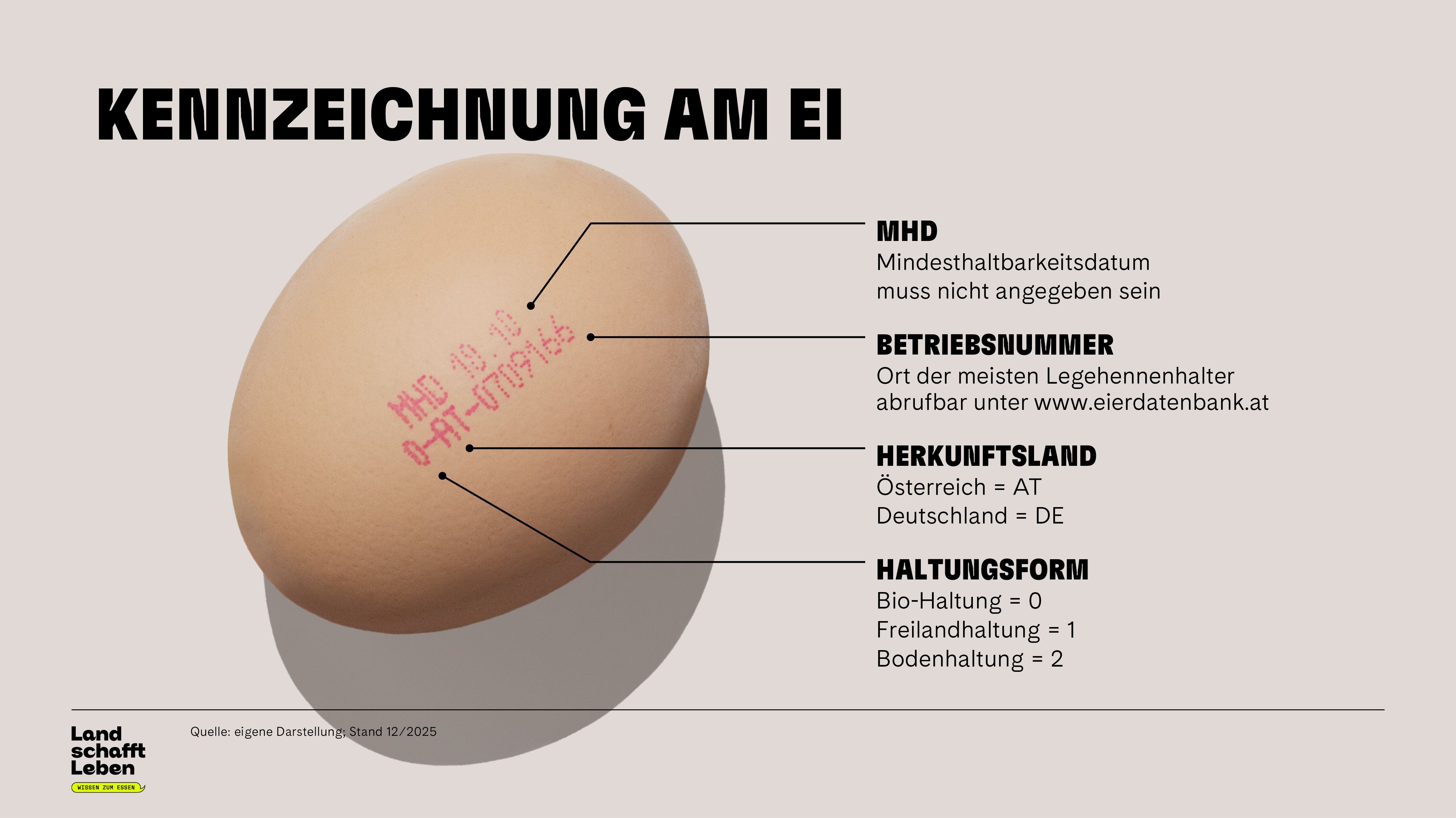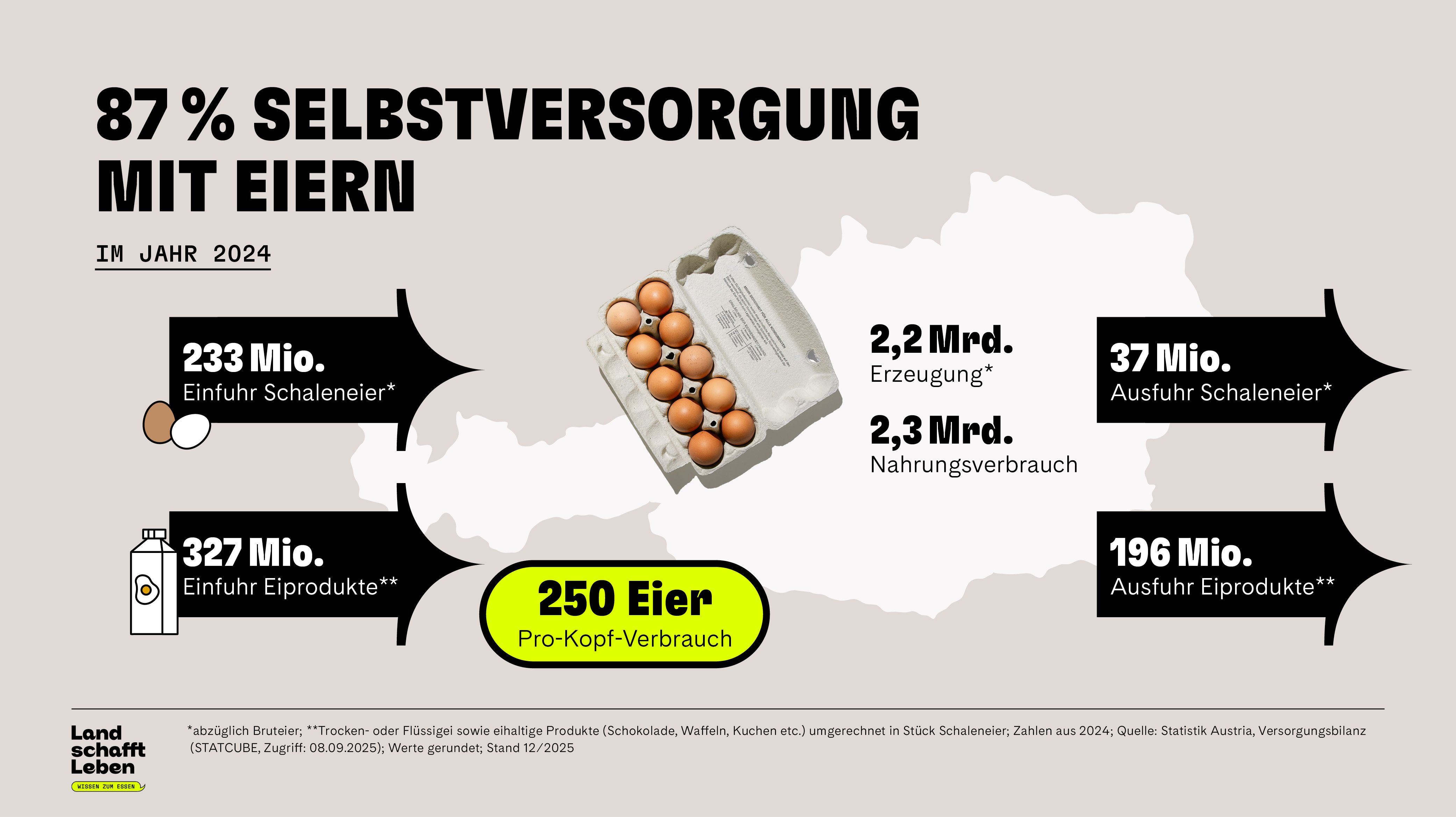 Österreich kann den eigenen Bedarf mit etwa 2,2 Milliarden produzierten Eiern pro Jahr fast selbst decken, der Selbstversorgungsgrad beträgt rund 90 Prozent. Eier werden hierzulande unter hohen Tierwohlstandards produziert – oft im Gegensatz zu günstiger, ausländischer Ware. Jegliche Form der Käfighaltung ist in Österreich seit 2020 verboten, der Import von Käfigeiern allerdings nicht. Täglich importiert Österreich 1,5 Millionen Eier – größtenteils aus Deutschland, was aber nicht heißen muss, dass die Eier von deutschen Hennen gelegt wurden. Grund dafür sind Re-Exporte: Beispielsweise importiert Deutschland Eier aus der Ukraine und exportiert sie dann weiter, etwa für den Großhandel oder in Form verarbeiteter Lebensmittel wie Kuchen, Nudeln oder Mayonnaise. Als Herkunftsland ist trotzdem Deutschland angegeben.