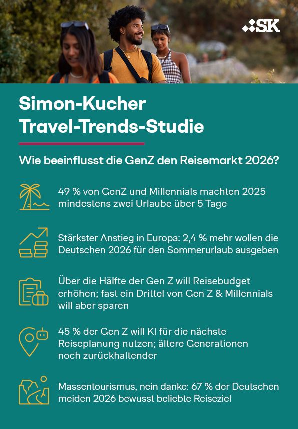Die Gen Z hat den Reisemarkt laut der Simon-Kucher Travel-Trends-Studie fest im Griff. So machte die Hälfte 2025 nicht nur zwei Reisen über 5 Tage - die Mehrheit der jungen Menschen will ihr Reisebudget für 2026 sogar weiter erhöhen. Der Effekt dieses Trends? Deutschland verzeichnet in Europa den größten Anstieg bei geplanten Reiseausgaben. Auch bei der Reiseplanung mit KI hat die Gen Z die Nase vorn. Trotzdem suchen die meisten nach besonderen Destinationen: Zwei von drei Deutschen wollen beliebte Reiseziele meiden, um Massentourismus und hohen Preisen zu entgehen.