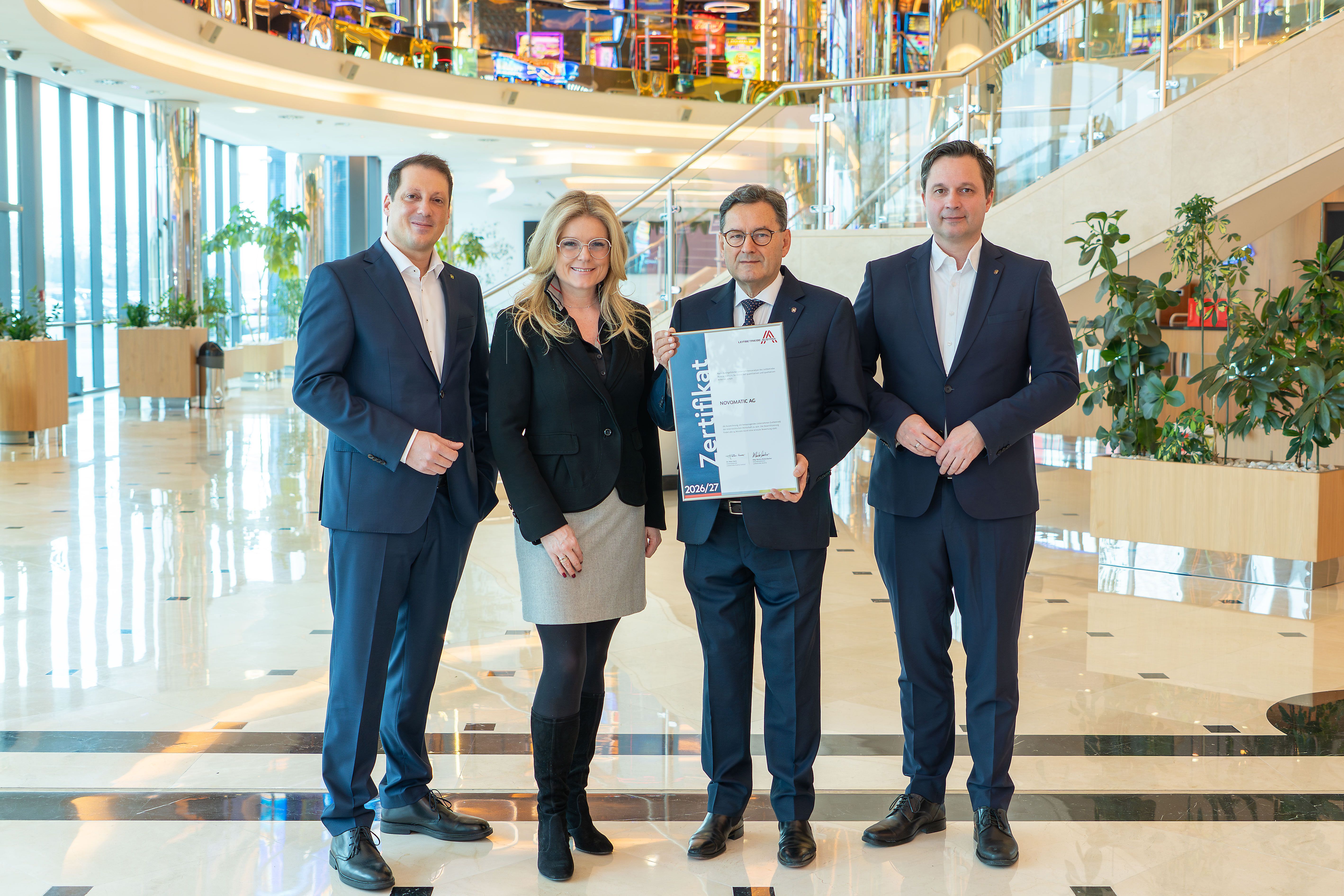 „Langfristiger Unternehmenserfolg basiert auf Stabilität, Innovationskraft und klarer Verantwortung gegenüber Mitarbeitern, Gesellschaft und Umwelt“, betont NOVOMATIC-Vorstand Mag. Stefan Krenn im Zuge der Zertifikatsübergabe am niederösterreichischen Headquarter zusammen mit den Vorständen Dipl.-Ing. Ryszard Presch und Mag. Johannes Gratzl. „Die erneute Rezertifizierung als Leitbetrieb bestätigt unsere strategische Ausrichtung und unseren Anspruch, wirtschaftliche Stärke mit nachhaltiger Unternehmensführung zu vereinen.“ Auch Mag. Monica Rintersbacher, Geschäftsführerin von Leitbetriebe Austria, hebt die Bedeutung der Auszeichnung hervor: „NOVOMATIC steht seit vielen Jahren exemplarisch für das, was einen Leitbetrieb ausmacht: internationale technologische Innovationskraft auf der einen Seite und eine klar gelebte Verantwortung gegenüber Standort, Mitarbeitern und Gesellschaft auf der anderen. Mit der Rezertifizierung unterstreicht das Unternehmen seine Rolle als stabiler Impulsgeber für Wirtschaft und Beschäftigung in Österreich.“