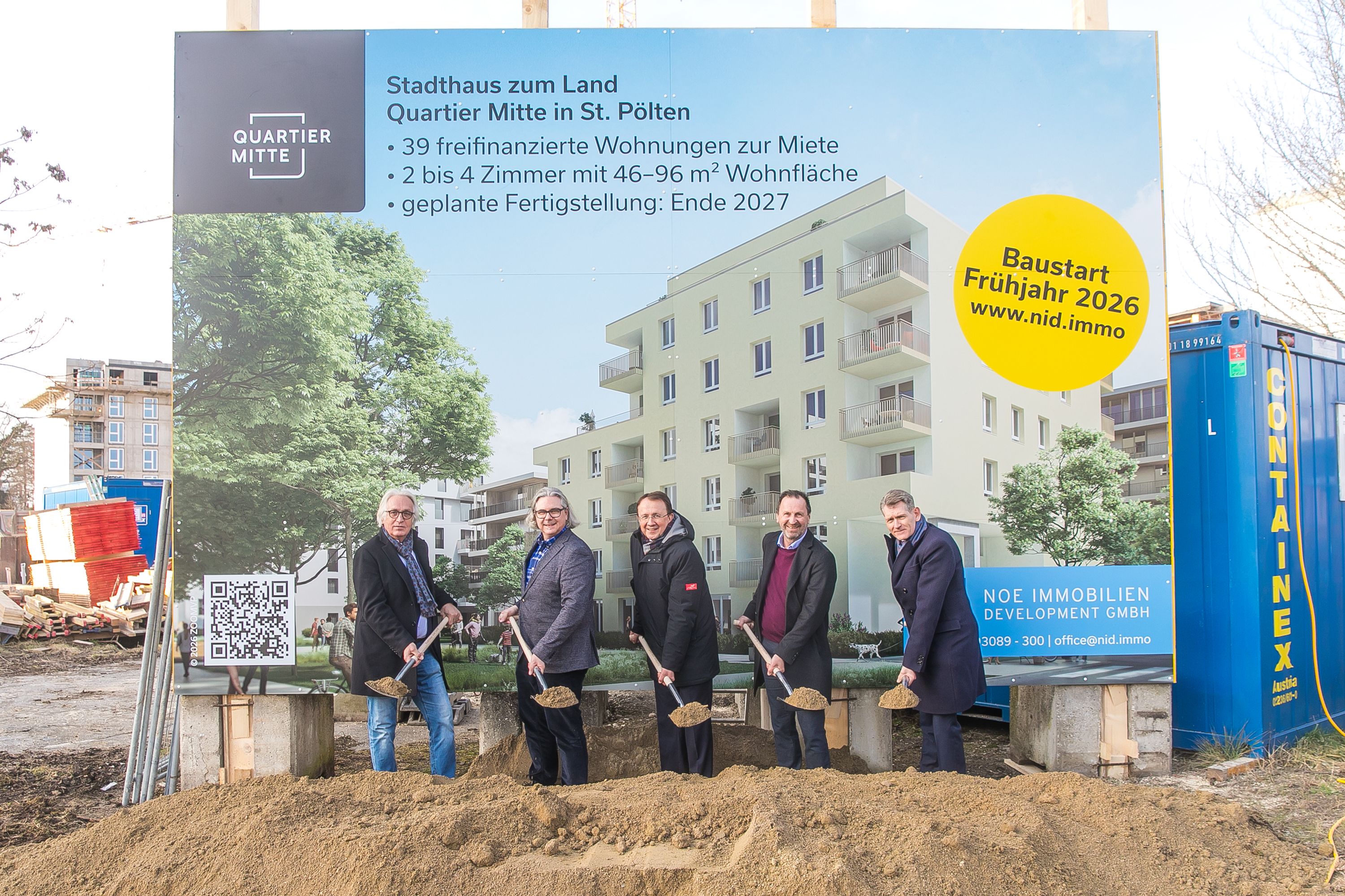 Mit dem zeitgleichen Baustart der beiden Wohnhäuser mit den Namen „Stadthaus zum Park“ und „Stadthaus zum Land“ zeigt die NID unternehmerische Stärke und schafft über 5.200 m² Wohnfläche für die zukünftigen Bewohner:innen von St. Pölten. Gemeinsam mit dem Generalunternehmer Steiner Bau GmbH werden auf dem Areal bis Ende 2027 über 80 moderne Mietwohnungen mit 2 – 4 Zimmern fertiggestellt. Die NID festigt damit ihre Rolle als einer der stärksten gewerblichen Bauträger der Region. „Das Quartier Mitte steht exemplarisch für eine zeitgemäße Stadtentwicklung, bei der Nutzungsmischung, Standortqualität und wirtschaftliche Tragfähigkeit zusammengedacht werden. Mit dem Doppel-Spatenstich setzen wir ein klares Bekenntnis zur Weiterentwicklung St. Pöltens und schaffen nachhaltigen Wohnraum dort, wo Nachfrage, Infrastruktur und urbane Qualität zusammenkommen