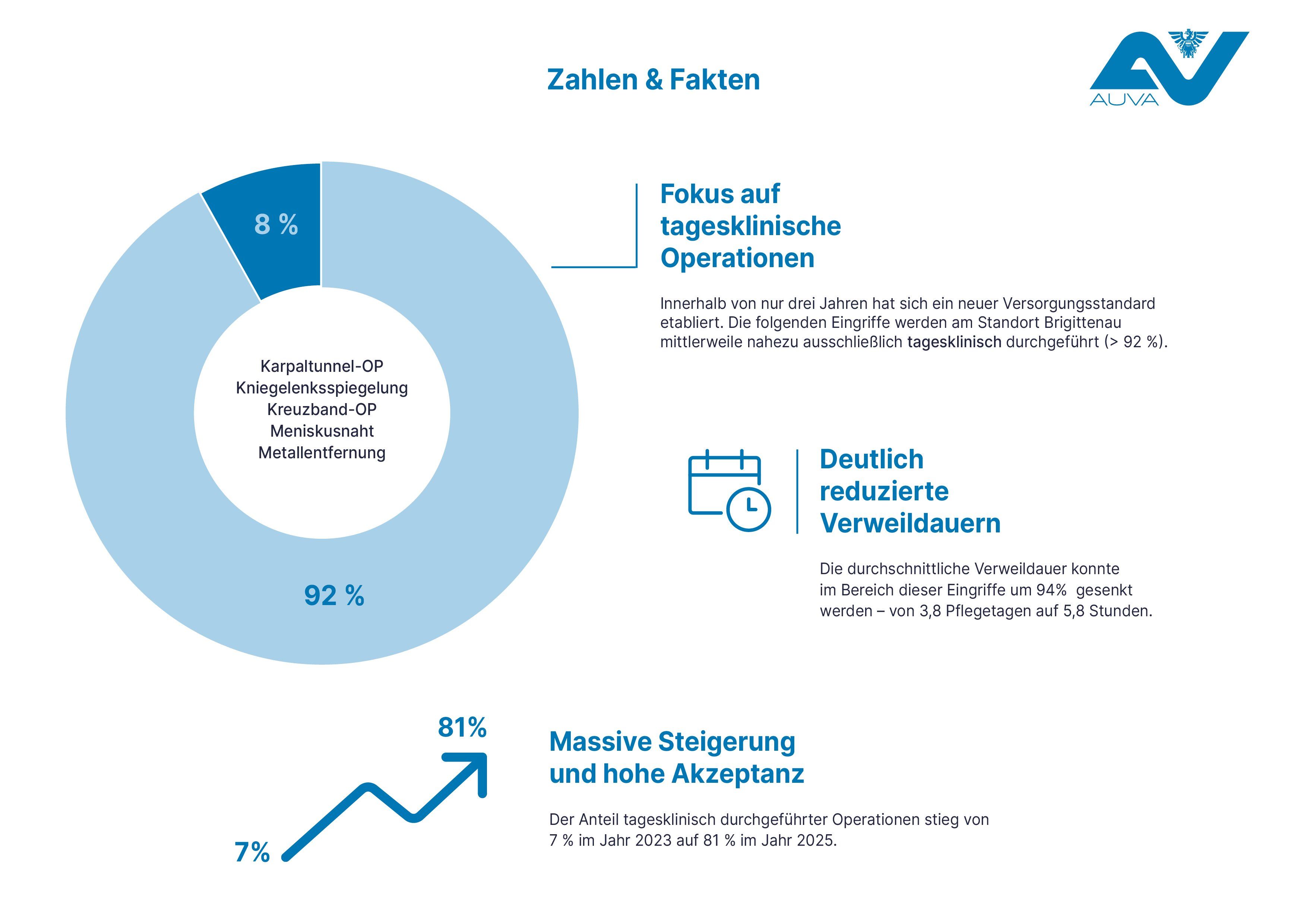 Das Prinzip „Morgens operiert, abends daheim“ bietet dabei handfeste medizinische Vorteile. Durch den kurzen Aufenthalt von durchschnittlich unter fünf Stunden sinkt das Risiko für nosokomiale (im Krankenhaus erworbene) Infektionen signifikant. Zudem fördert die schnelle Rückkehr in die vertraute Umgebung die psychische Erholung und Genesung der Patientinnen und Patienten. Das Traumazentrum Wien verfügt über jahrzehntelange unfallchirurgisch-orthopädische Erfahrung – eine Grundvoraussetzung für die sichere Ausweitung des Angebots.