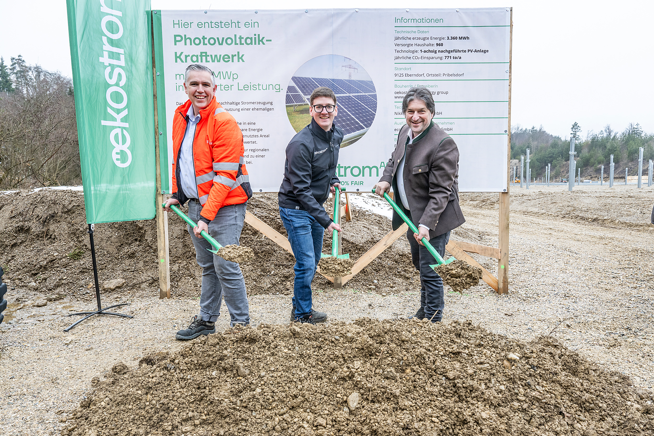 In Pribelsdorf in der Marktgemeinde Eberndorf (Bezirk Völkermarkt) startet heute der Bau des ersten Photovoltaikkraftwerks der oekostrom AG in Kärnten. Auf einer knapp drei Hektar großen, ehemaligen Kiesgrube entsteht eine moderne PV-Anlage mit 2,6 MWp Leistung, die künftig rund 1.000 Haushalte mit sauberem Strom versorgt.