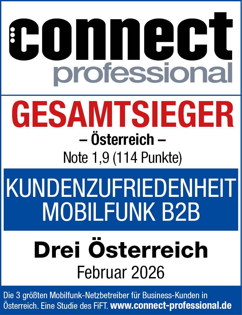 Drei konnte beim jährlichen connect professional B2B Kundenbarometer die Österreich-Wertung zum fünften Mal für sich entschieden – und lag in der Gesamtwertung deutlich vor den Mitbewerbern A1 und Magenta.
