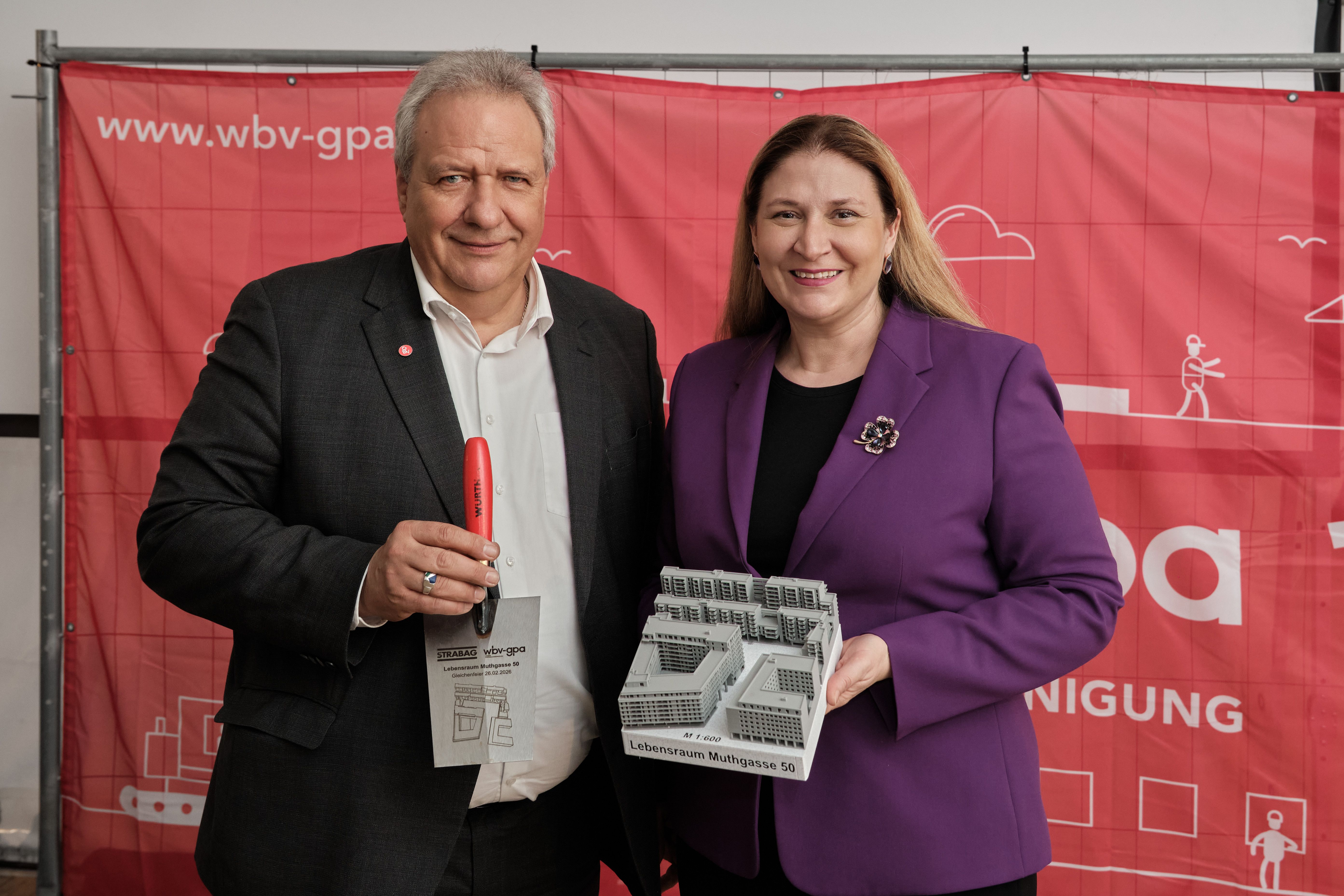 Mit der planmäßigen Fertigstellung des Rohbaus hat die gemeinnützige Bauvereinigung WBV-GPA gemeinsam mit der STRABAG AG am 26. Februar die Dachgleiche für das Wohnquartier „Lebensraum Muthgasse 50“ gefeiert.