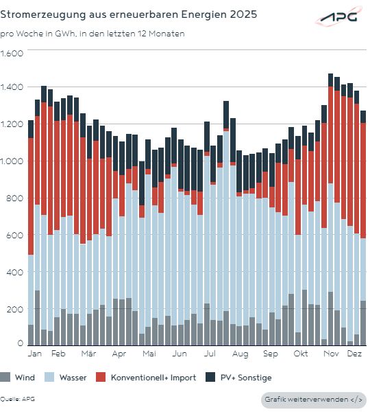 „Die Strombilanz 2025 und dabei insbesondere die Einspeisung von Erneuerbaren verdeutlichen die Volatilität im Bereich der erneuerbaren Produktion. Besonders in den Wintermonaten zwischen Oktober und Februar konnten wir die Versorgungssicherheit nur aufrechterhalten, weil die Gaskraftwerke auf Hochtouren gefahren sind und wir Strom aus unseren Nachbarländern importieren konnten. Die hohen Importe der vergangenen Monate belegen, wie bedeutend eine kapazitätsstarke und international vermaschte Netzinfrastruktur ist“, sagt Gerhard Christiner, Vorstandssprecher von Austrian Power Grid (APG).