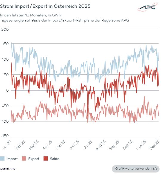 In acht von 12 Monaten musste Österreich Strom bilanziell aus dem Ausland importieren (Vergleich 2024: drei Import-Monate) und auf das gesamte Jahr gerechnet ergab sich in Österreich (Regelzone APG*) auf Basis der saldierten Import-/Exportfahrpläne ein Import-Überhang in der Höhe von 5.360 GWh (dies bedeutet eine Differenz von 10.107 GWh gegenüber dem Export-Saldo 2024). Konnte 2025 an nur 112 Tagen bilanziell Strom ins Ausland exportiert werden, so war dies im Jahr davor an 243 Tagen möglich.