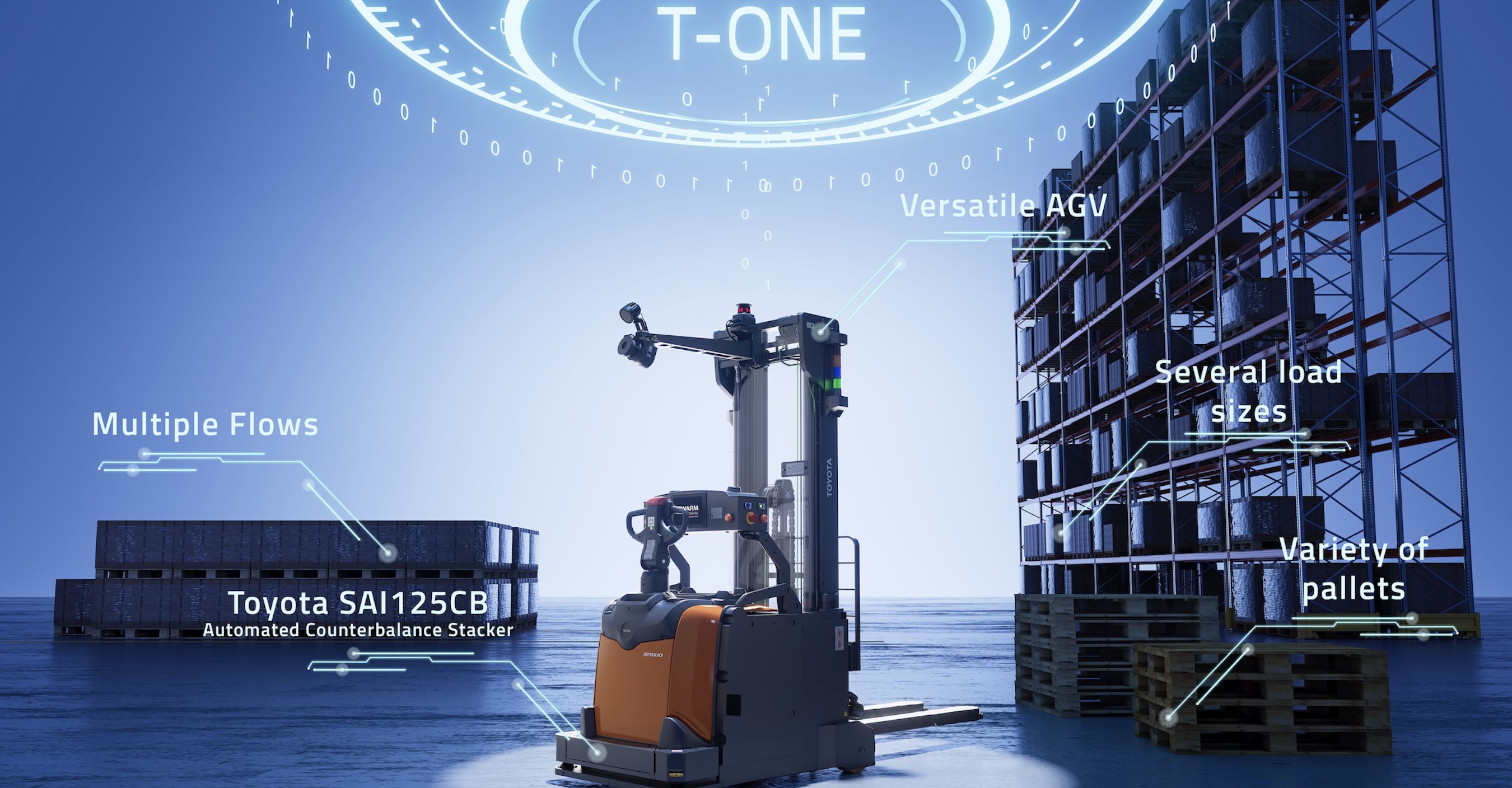 Kern der Lösung ist die Kombination aus dem automatisierten Gegengewichts-Hochhubwagen Toyota SAI125CB und der Automatisierungssoftware T-ONE Control System. Swarm Automation Transport integriert sich flexibel in bestehende Lagerprozesse und unterstützt eine Vielzahl logistischer Anwendungen – auch in komplexen Umgebungen. Besonders geeignet ist die Lösung für Unternehmen, die mit unterschiedlichen Palettentypen arbeiten, etwa Europaletten oder geschlossene Paletten. Auch spezielle Anforderungen wie die Aufnahme gedrehter Paletten lassen sich zuverlässig abbilden.