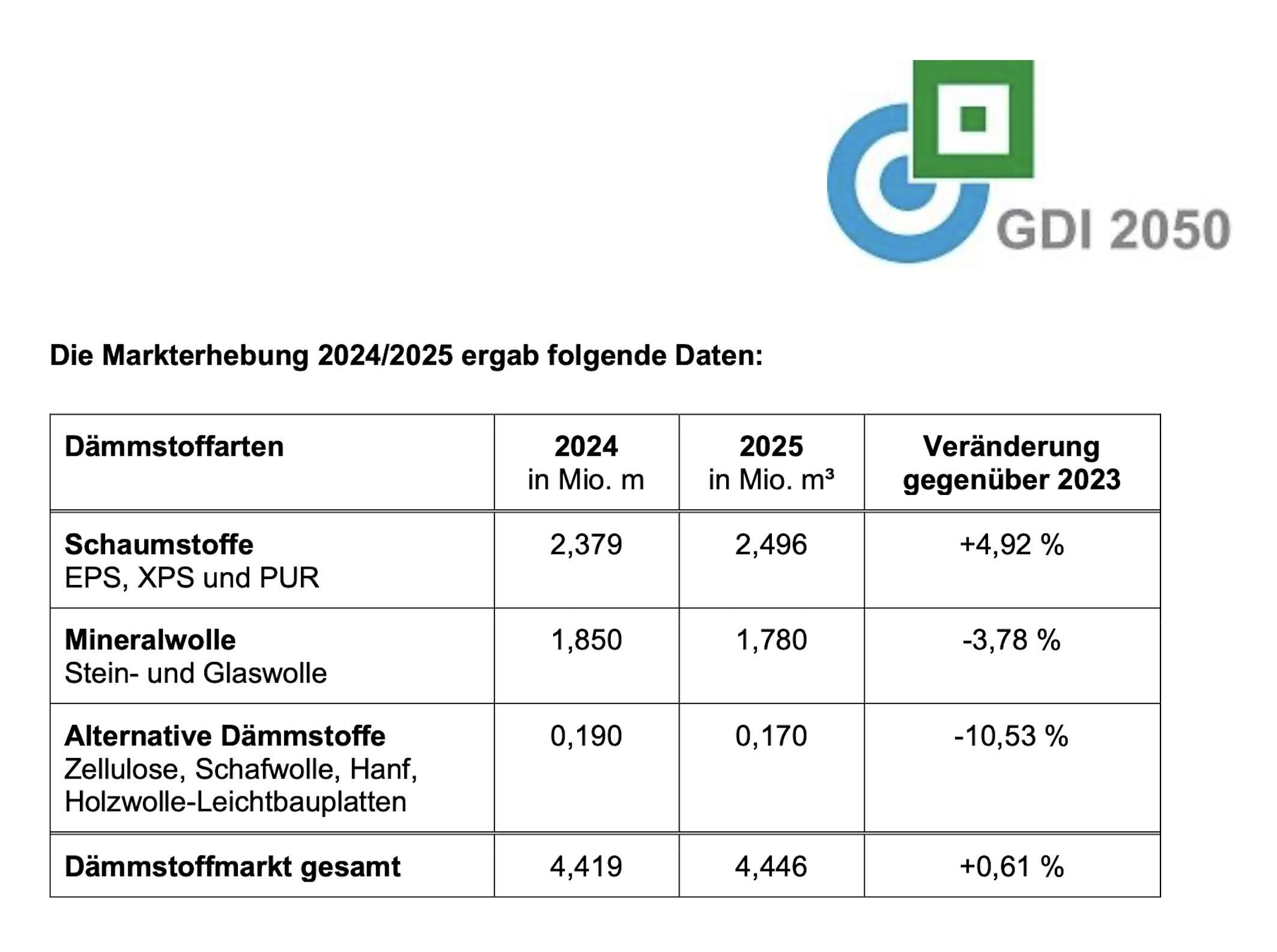 Innerhalb der einzelnen Dämmstoffarten zeigt sich 2025 ein differenziertes Bild: Die Schaumstoffe (EPS, XPS und PUR) legten um 4,92 Prozent auf 2,496 Millionen m³ zu. Die Mineralwolle (Stein- und Glaswolle) verzeichnete hingegen ein Minus von 3,78 Prozent auf 1,780 Millionen m³. Die vor allem im Einfamilienhausbau verwendeten alternativen Dämmstoffe – etwa Zellulose, Schafwolle oder Hanf – gingen um 10,53 Prozent auf 0,170 Millionen m³ zurück.