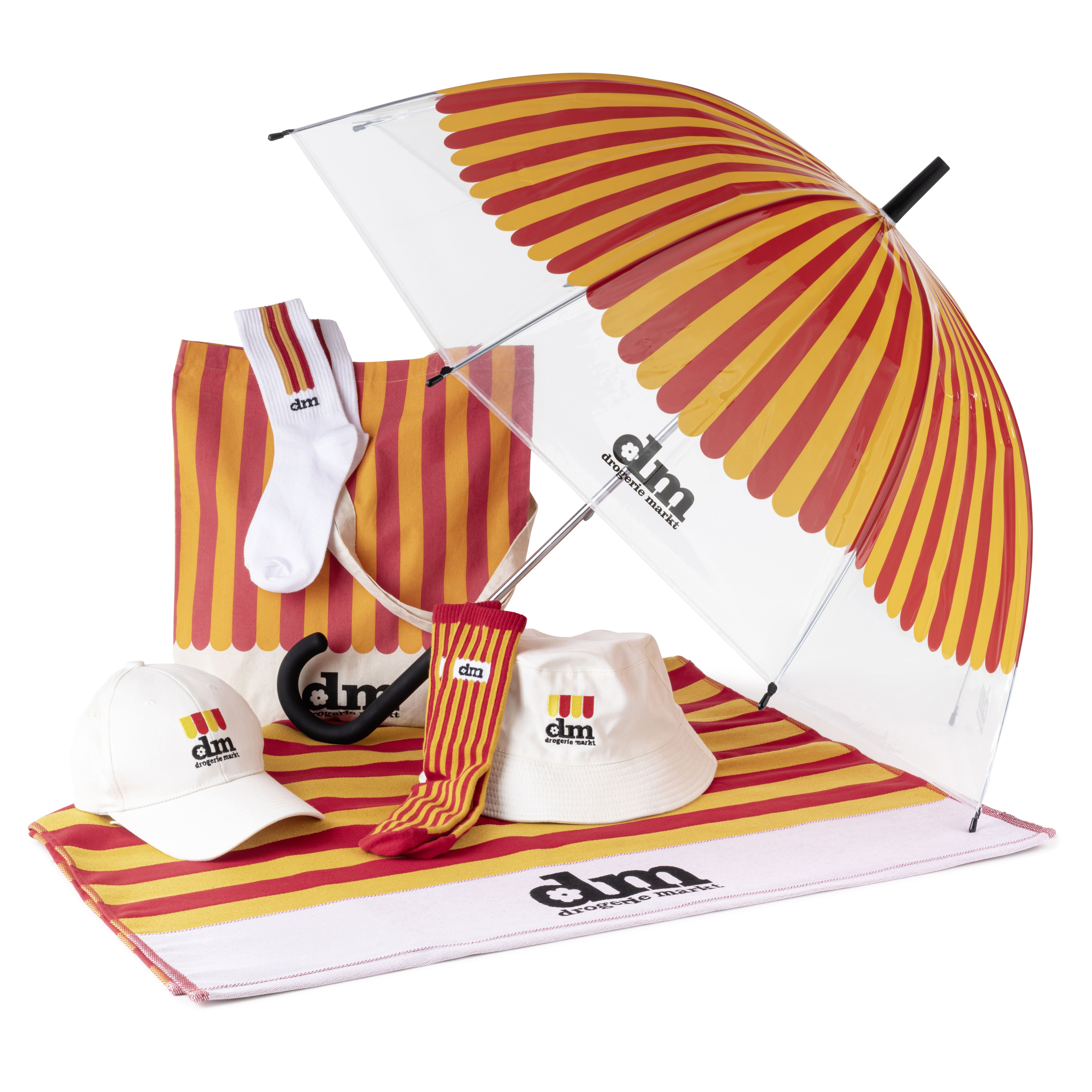 Genau dieses Gefühl holt dm jetzt in den Alltag zurück. Die Vintage-Kollektion vereint nostalgische Details mit aktuellen Trends – und macht das klassische Logo zur „Marke zum Anziehen“. Ab 8. April sorgen zwei Paar klassische Tennissocken mit Streifen, ein gemütliches Strandtuch, eine Cap und ein lässiger Bucket Hat für Retro-Vibes. Wenn das Wetter nicht mitspielt, kommt der transparente Regenschirm mit rot-orangen Streifen zum Einsatz. Und der tägliche Einkauf bei dm wird mit der Vintage-Baumwolltasche zum stylischen Statement.