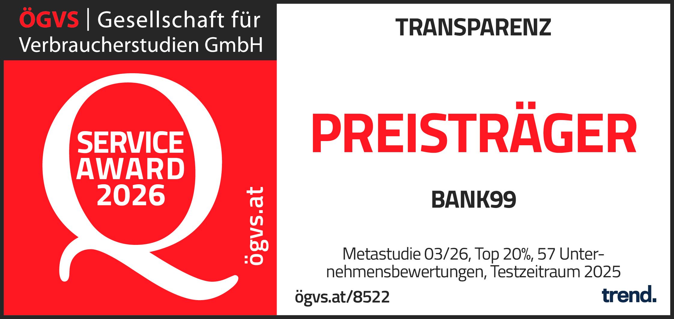- Anlass: bank99 belegt beim ÖGVS-Service-Award 2026 den ersten Platz in der Kategorie Transparenz bei Girokonten