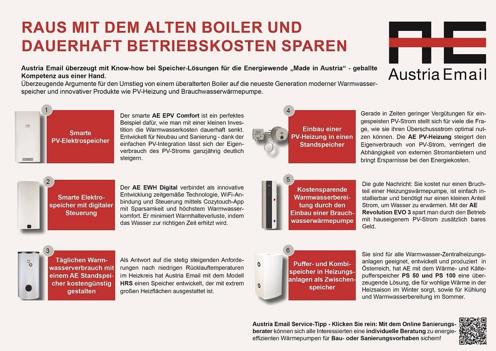 In Zeiten, da viele beim Wohnen sehr genau aufs Geld schauen müssen, sind energieeffiziente Warmwasserlösungen ein echter Gewinn. Die Ersparnis bei den monatlichen Ausgaben für Energie im Haushalt ist deshalb ein starkes Argument für den Umstieg von einem überalterten Boiler auf einen neuen Warmwasserspeicher. Denn so lässt sich mit einer überschaubaren Investition eine spürbare Betriebskostenersparnis realisieren. Entsprechend dem PV-Boom setzt die Austria Email AG als führendes Kompetenzzentrum für Stand- und Pufferspeicher bei ihrem Sortiment auf neue Entwicklungen, die die Nutzung von selbst erzeugtem PV-Strom durch einfache PV-Integration optimieren. Zusätzlich zu innovativen Speicherlösungen für Einfamilienhäuser und den mehrgeschossigen Wohnbau überzeugt der heimische Hersteller mit nachhaltigen Produkten wie PV-Heizung und Brauchwasserwärmepumpen.