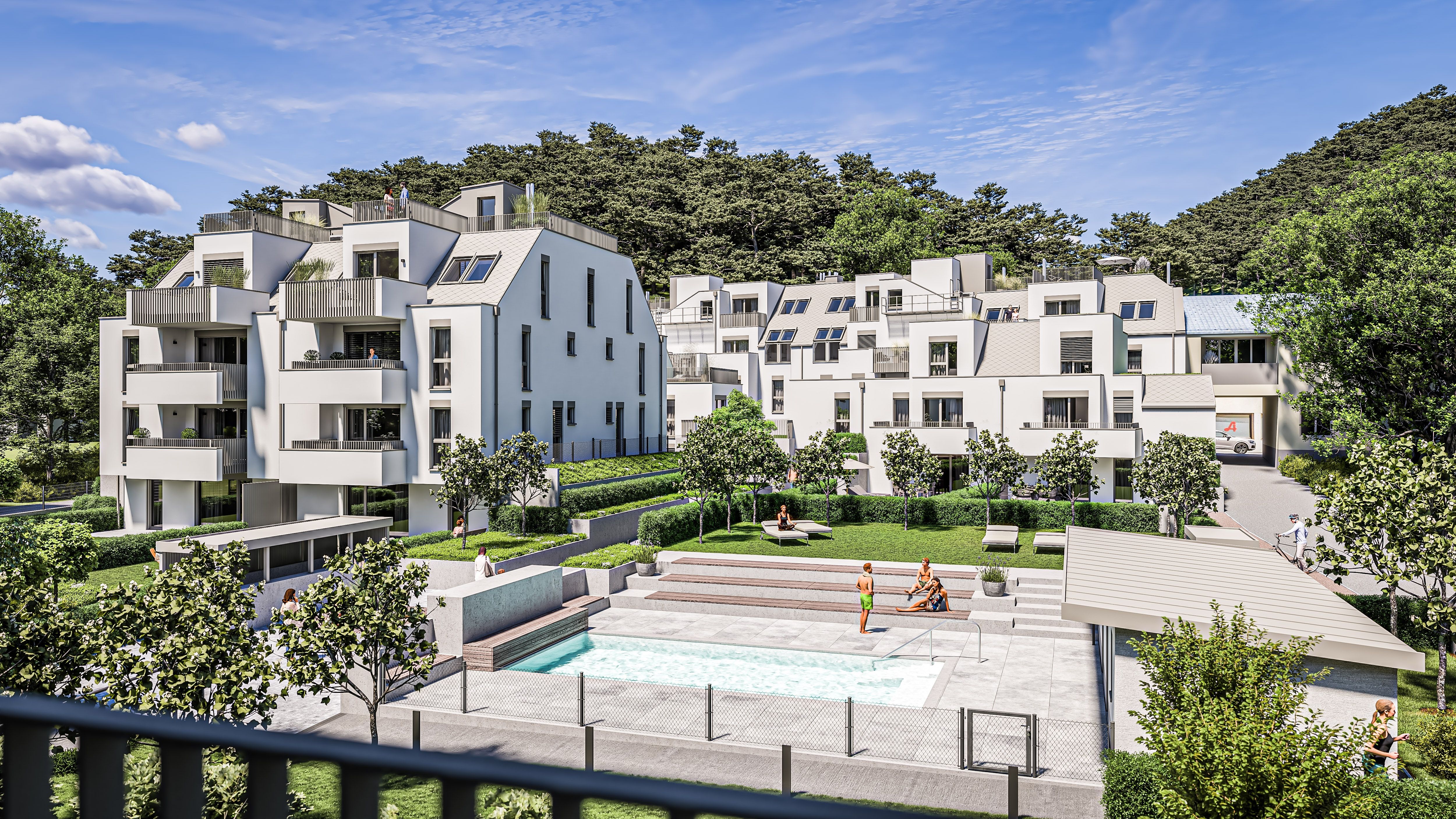 KALKSBURGA besticht durch eine durchdachte Architektur, die den Spagat zwischen Stadtkomfort und ländlicher Idylle meistert. Das Projekt umfasst eine exklusive Auswahl an freifinanzierten Eigentumswohnungen sowie großzügig dimensionierten Doppelhaushälften. Das Konzept „Stadt – Land – Pool“ bietet den künftigen Bewohnern neben einer exklusiven Ausstattung auch Highlights wie ein Concierge Service vor Ort, einen hauseigenen Outdoor-Pool mit Poolhaus und eine Fahrrad-Waschstation. Bei diesem Projekt liegt der Fokus klar auf einer Maximierung der Lebensqualität: Jede Einheit verfügt über private Freiflächen wie Eigengärten, Terrassen oder Balkone. Eine nachhaltige Projektentwicklung sowie eine hochwertige Ausstattung garantieren eine langfristige Wertsteigerung der Objekte.