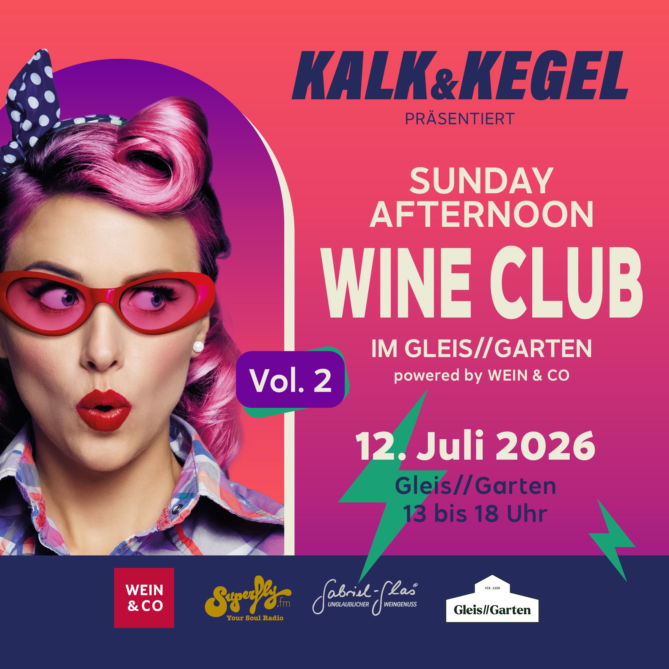 Tickets für den KALK&KEGEL „Sunday Afternoon Wine Club“ powered by WEIN & CO im Gleis//Garten können ab sofort im vergünstigten Vorverkauf um nur 33 Euro statt 66 Euro im Onlineshop unter www.kalkundkegel.com/shop gekauft werden.