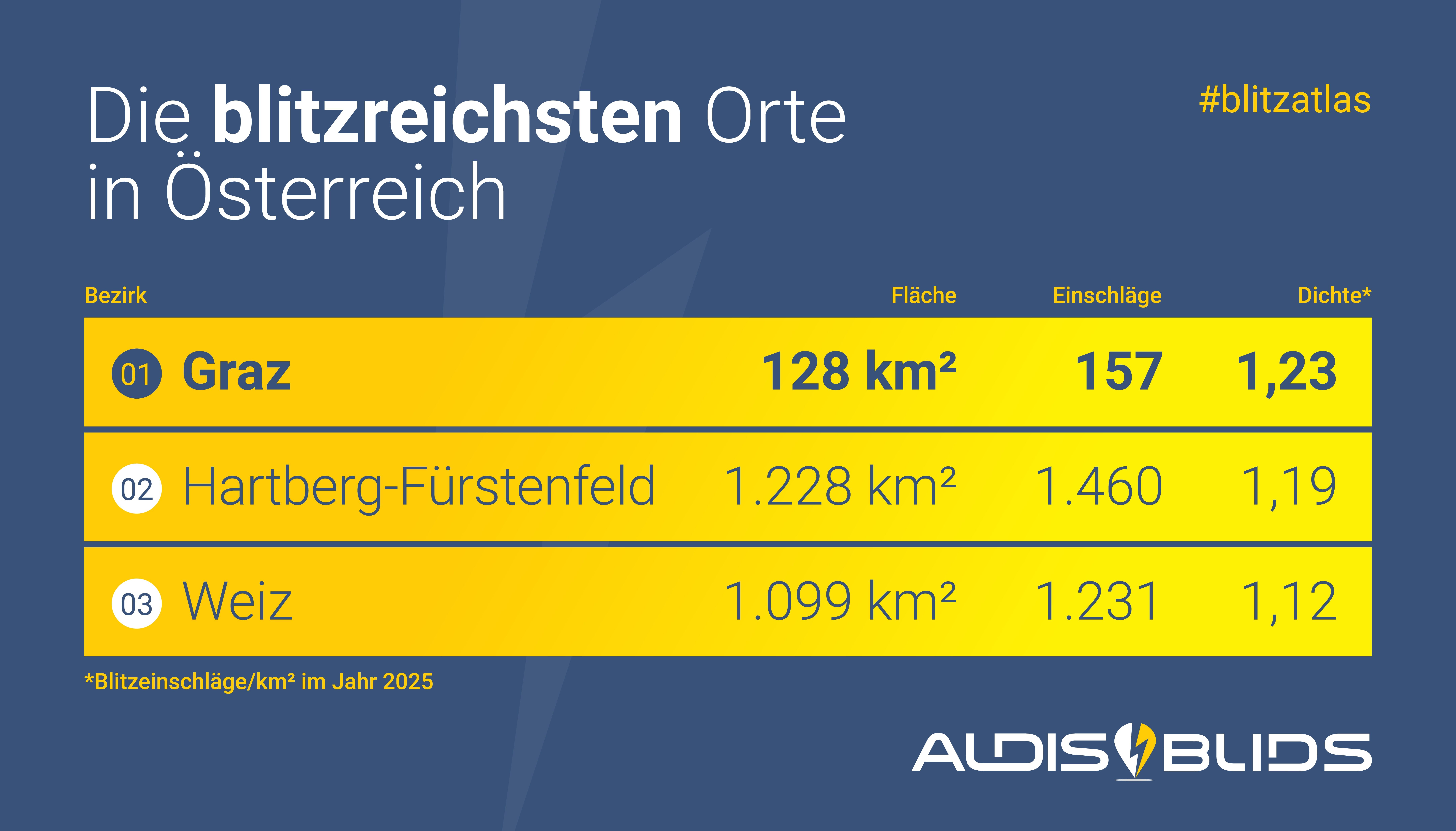 Mit 1,23 Blitzeinschlägen pro Quadratkilometer liegt Graz (Stadt) im Jahr 2025 an erster Stelle bei der Blitzdichte, gefolgt von Hartberg-Fürstenfeld (1,19) und Weiz (1,12). Die geringste Blitzdichte ermittelte ALDIS/BLIDS in Rust (Stadt) mit 0,15 Blitzereignissen pro Quadratkilometer sowie in Krems an der Donau (Stadt) mit 0,15 und Tulln (0,17).