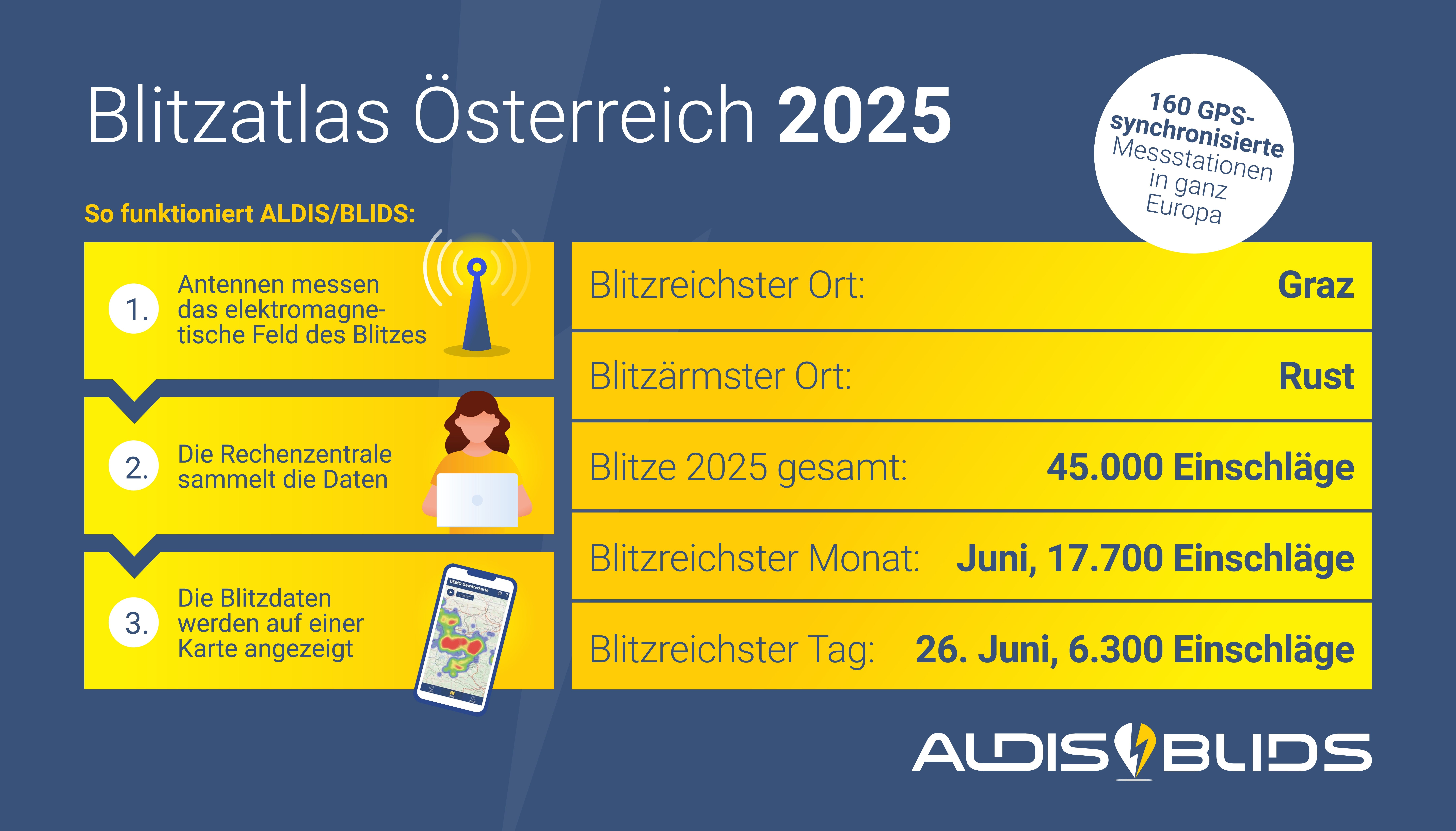 In Österreich sind 2025 so wenige Blitzeinschläge gemessen worden wie noch nie. Insgesamt hat der Blitz-Informationsdienst ALDIS/BLIDS im ganzen Jahr nur 45.000 Erdblitze (Wolke-Erde-Blitzschläge) registriert, das waren um 55 % weniger als im Jahr davor. Dies geht aus dem aktuellen Blitzatlas mit Messungen aus allen 94 Bezirken hervor. Österreichischer Blitz-Hotspot war Graz.