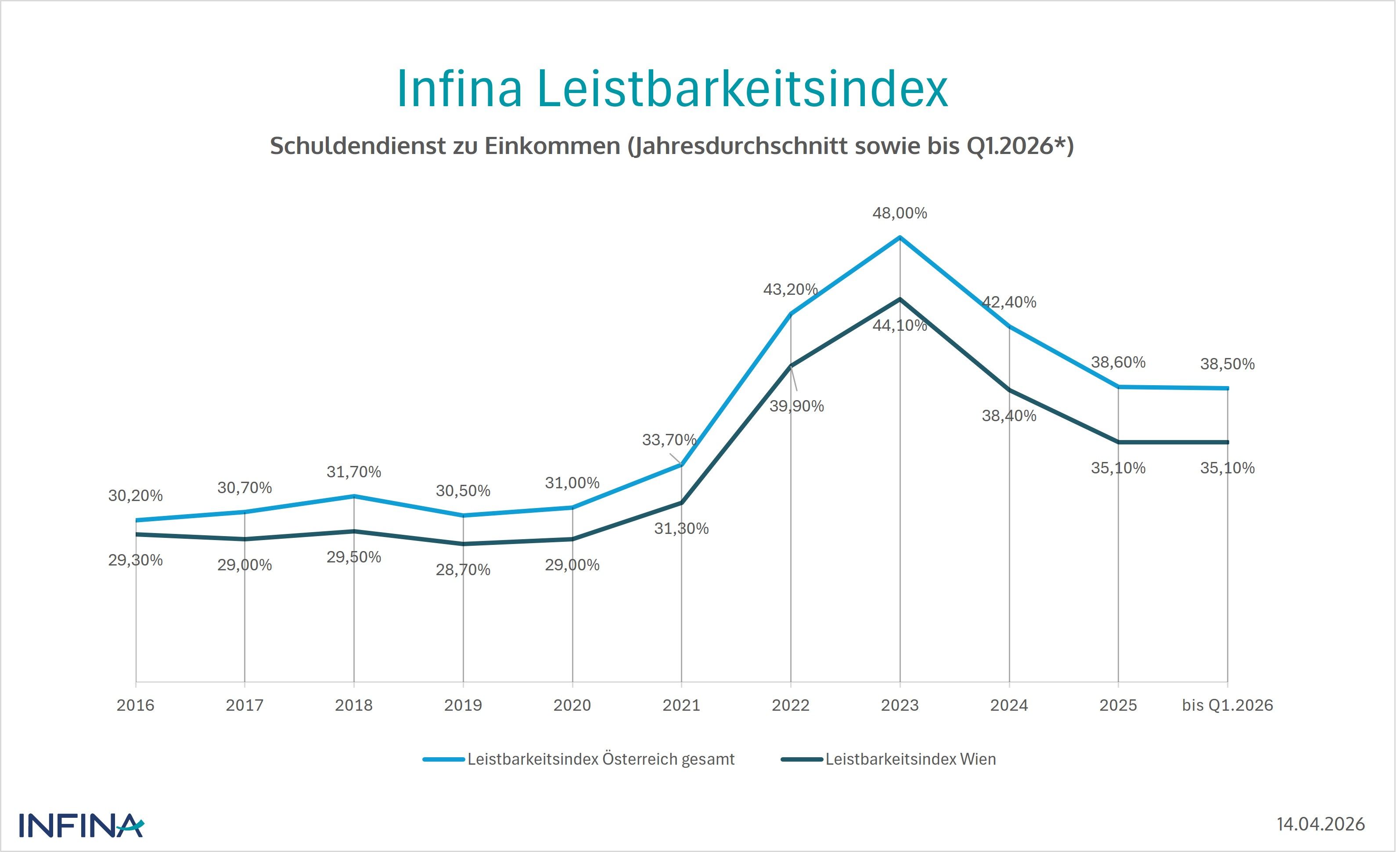 Für 2026 zeichnet sich voraussichtlich im weiteren Jahresverlauf eine Verschlechterung ab. Steigende Immobilienpreise, vor allem in den Ballungsräumen, sowie höhere Zinsen dürften die Schuldendienstquoten für die private Wohnbaufinanzierung erneut steigen lassen. Das erste Quartal stellt dabei ein Übergangsquartal dar. Es gab noch gewisse Einkommenssteigerungen, und der Zinsanstieg hat sich noch nicht entfaltet. Entsprechend stagnierte die Quote des Anteils am Einkommen laut Infina-Schnellschätzung bei 38,5 % für Österreich gesamt und bei 35,1 % für Wien.
