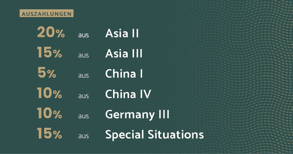 Die sechs genannten Private-Equity-Dachfonds befinden sich allesamt in der sogenannten Auszahlungsphase. Sobald diese beginnt, werden Rückflüsse aus erfolgreichen Unternehmensverkäufen in Tranchen an die Anleger ausgezahlt. Der RWB China I erreicht mit der zwölften Ausschüttung eine Gesamtauszahlungsquote von 351 Prozent. Anlegerinnen und Anleger haben ihr ursprünglich investiertes Kapital bereits deutlich mehr als verdreifacht.