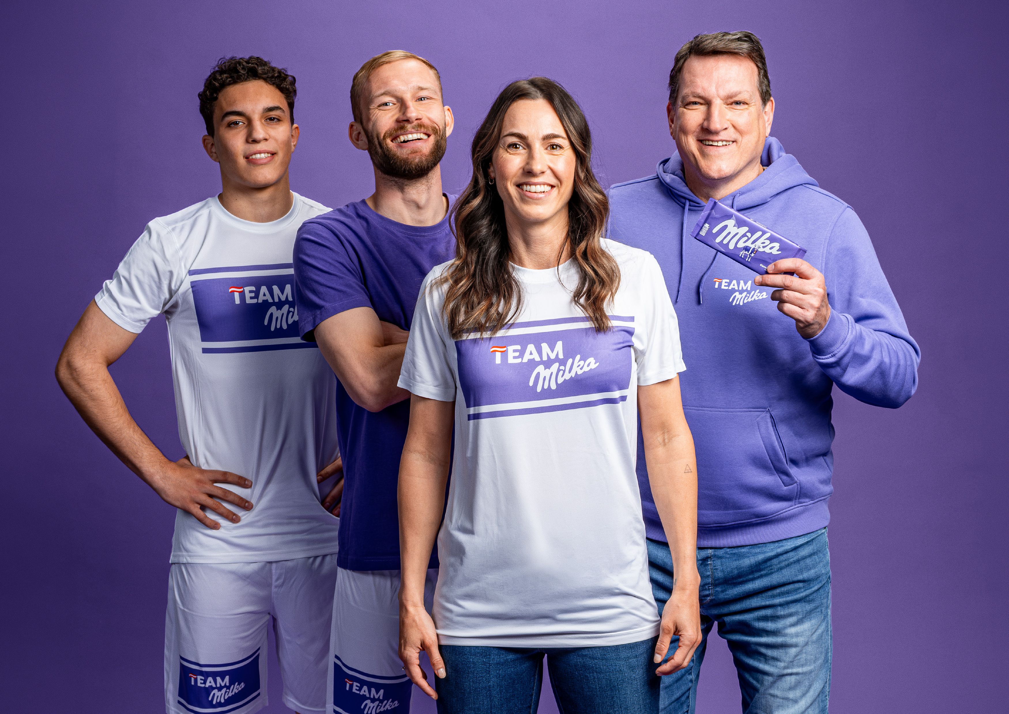 Viki Schnaderbeck, Andi Herzog, Konrad Laimer und Jakob Pokorny zeigen mit dem neuen „Team Milka“ die zarte Seite des Sports