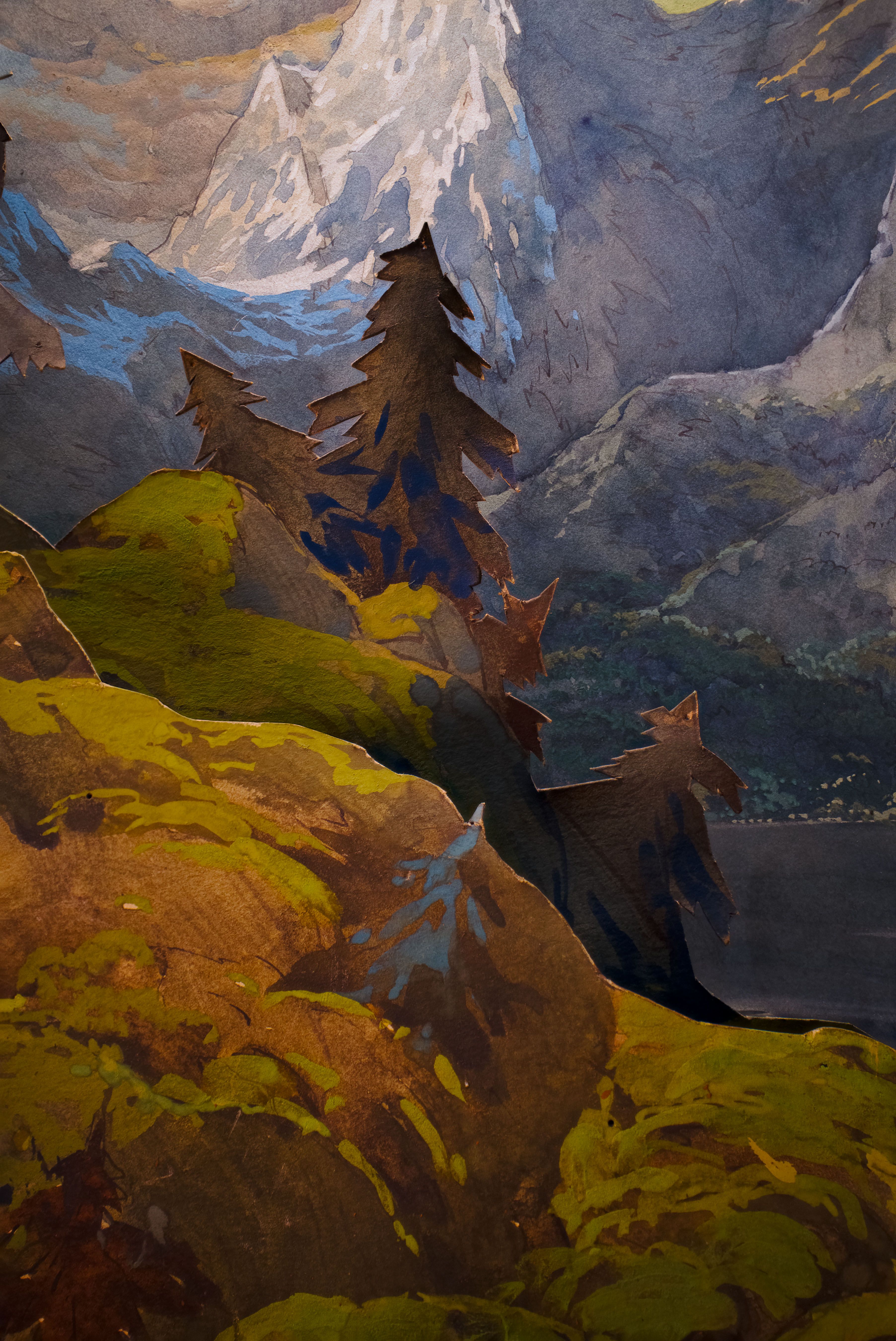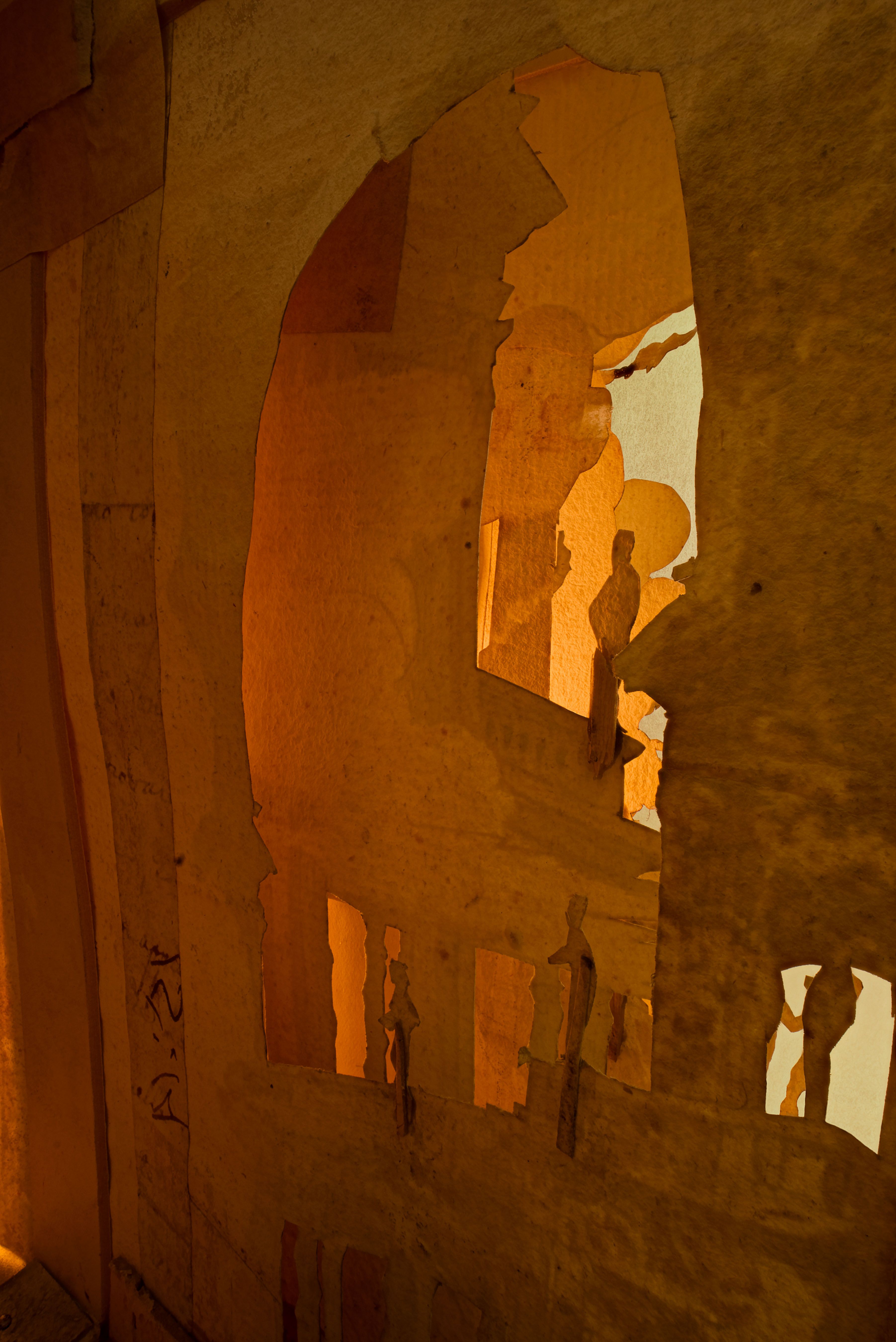 Ein raumgreifendes Panorama ruft in der Ausstellung die monumentale Gestalt einer Felswand auf. Es erinnert an den theatralischen Topos der Grotte und zugleich an jene unterirdischen Salzstöcke, in denen kostbare Fotoarchive lagern. Eigens vom Künstler entworfene Lichtquellen, die wiederum nach einem handgefertigten Modell aus Pappe produziert wurden, pointieren den Raum und verstärken den Eindruck einer Inszenierung, die sich atmosphärisch um die neuen Bilder legt.