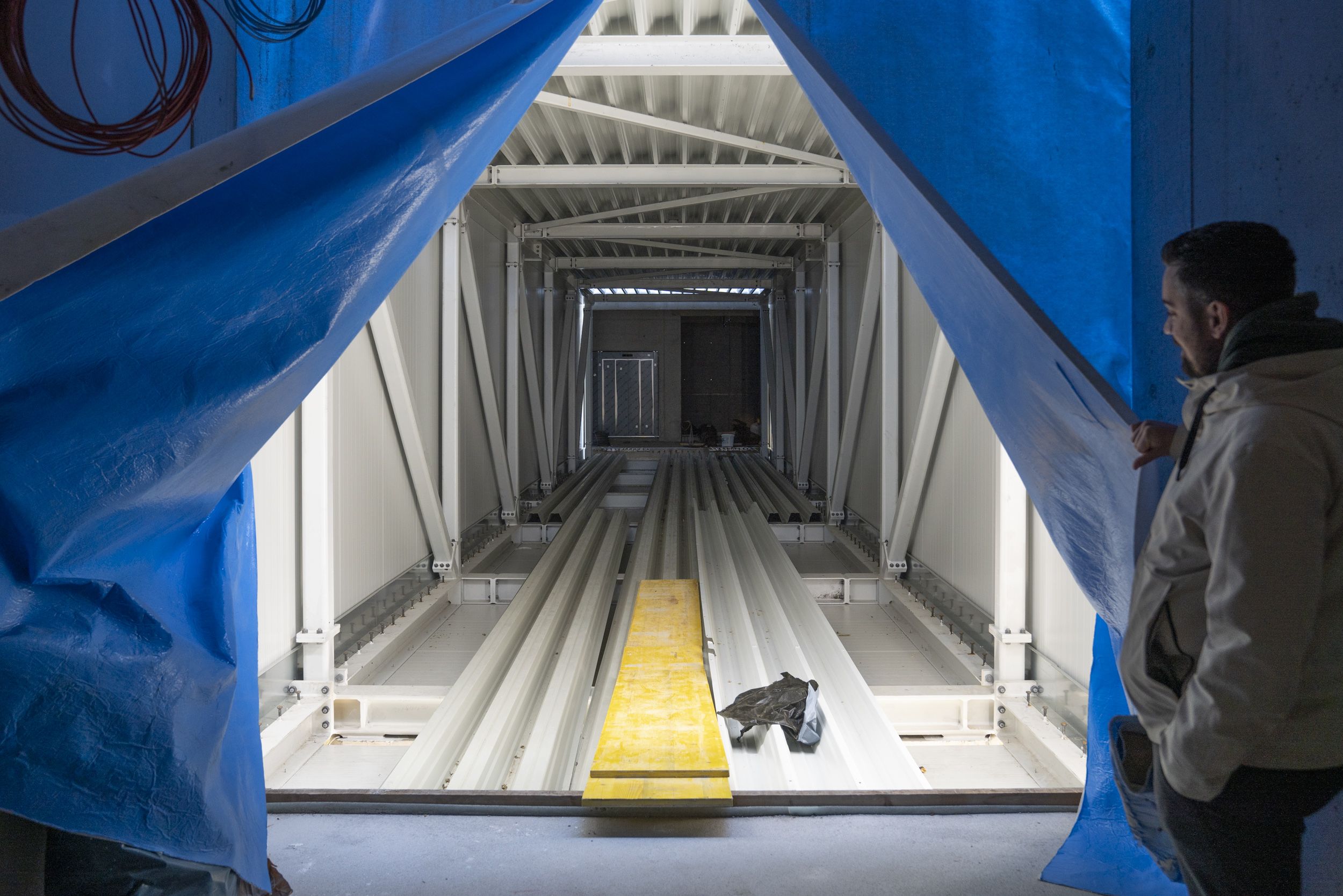 Denn auch abseits der markanten Brücke schreiten die Arbeiten zügig voran. Während an der Außenhülle die Vollwärmeschutz-Fassade hergestellt wird, ist im Inneren der Trockenbau im Erdgeschoß bereits abgeschlossen. Der Fokus verlagert sich nun zusehends auf die Details: Maler- und Fliesenlegerarbeiten laufen ebenso wie die Montage der abgehängten Decken.