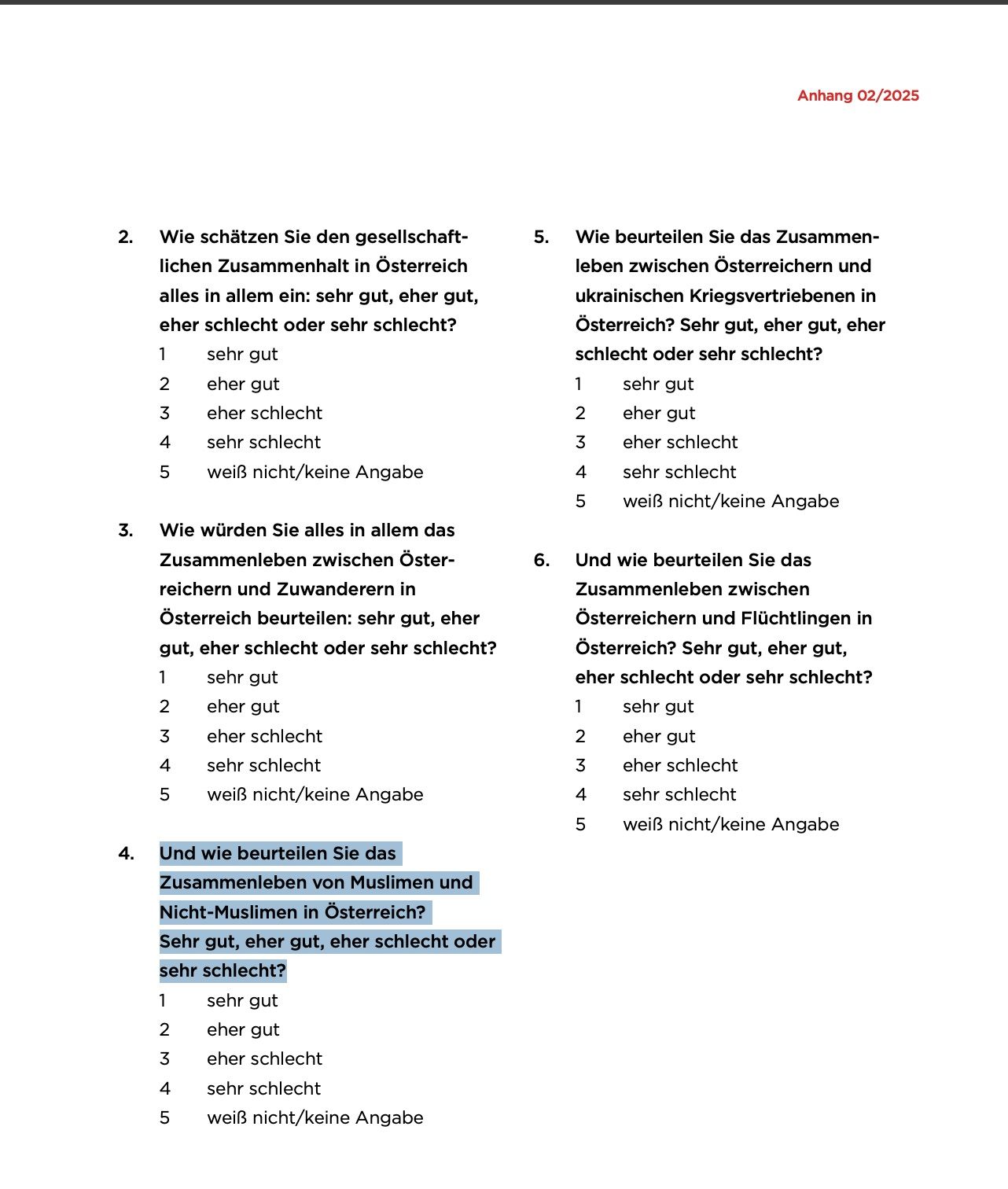 Frage 4 des Fragebogens lautet wörtlich: „Und wie beurteilen Sie das Zusammenleben von Muslimen und Nicht-Muslimen in Österreich?" Diese Frage steht in einer Reihe mit Frage 3 (Zusammenleben mit Zuwanderern), Frage 5 (ukrainische Kriegsvertriebene) und Frage 6 (Flüchtlinge). Religiöse Zugehörigkeit wird damit strukturell auf dieselbe Ebene gestellt wie aufenthaltsrechtlicher Status. Das ist kein Interpretationsfehler der TKG — das ist die wörtliche Fragebogenkonstruktion des ÖIF, nachzulesen auf Seite 2 des Anhangs der zweiten Fassung.